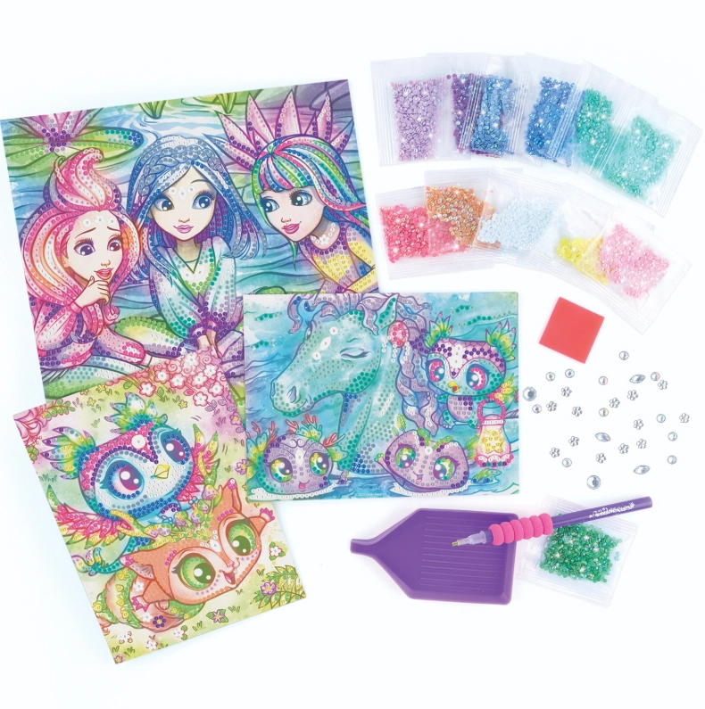 The set includes everything you need: a gem applicator, 3 pre-printed canvases, approx. 4,500 gems, a sorting tray, and a color illustrated guide. The activity is intuitive and soothing, supporting focus and patience.