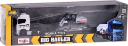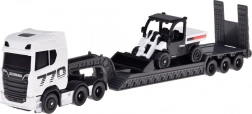 Discover the realistic SCANIA 770S set with a low-loader trailer and a functional loader, featuring faithful detailing and an attractive white–gray color combination. The metal cab shell and quality plastic chassis parts ensure durability even with frequent play.