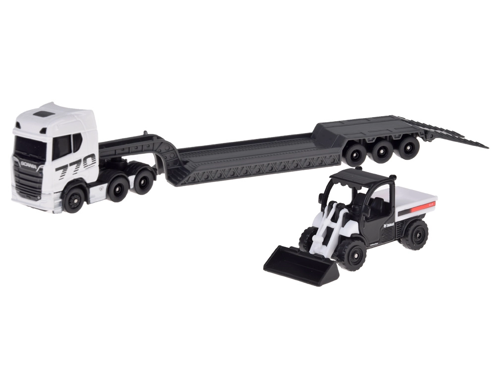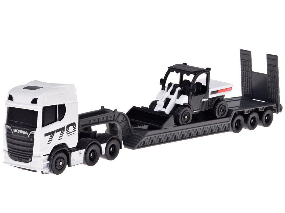 Licensed 1:64 model set featuring a SCANIA 770S with a low-loader trailer and a compact loader. Thanks to the metal body, precise detailing, and a detachable rig, it is ideal for collectors and creative play alike.