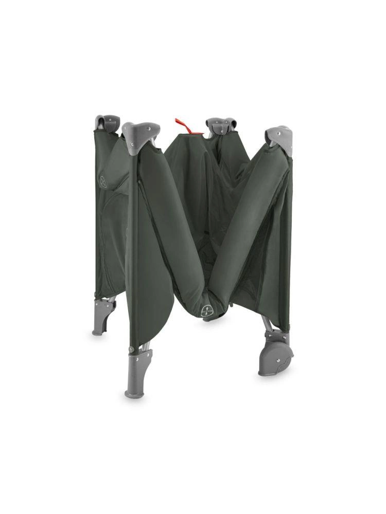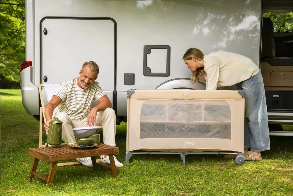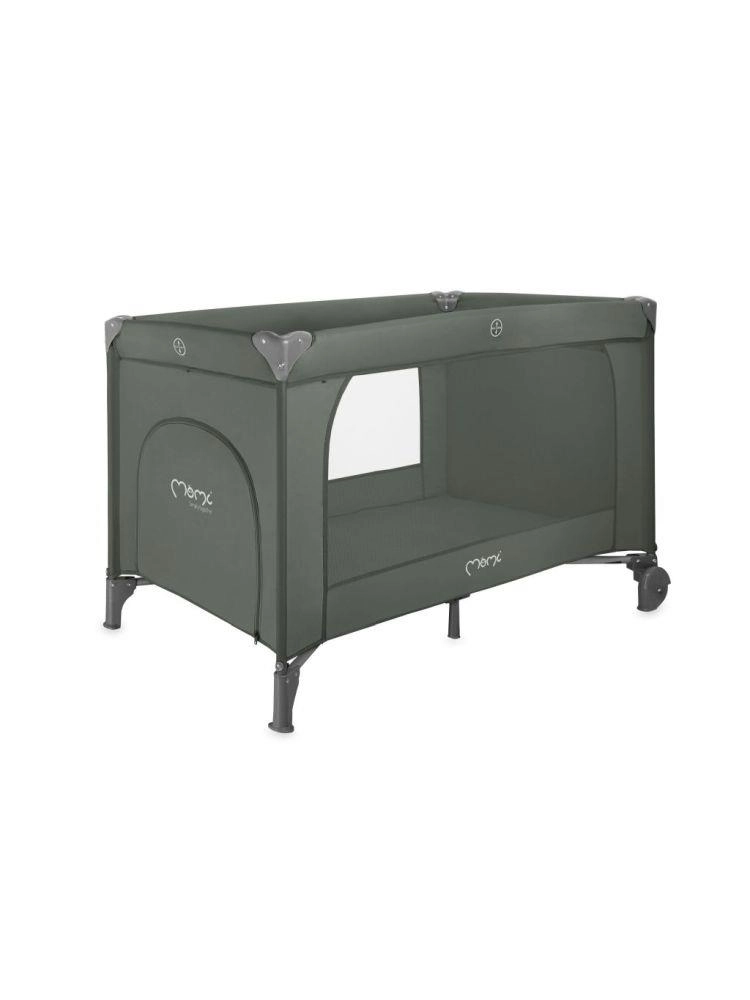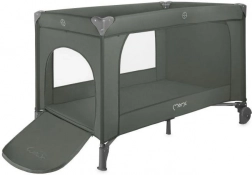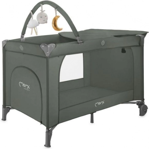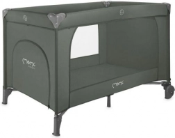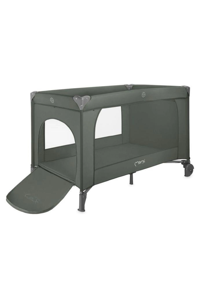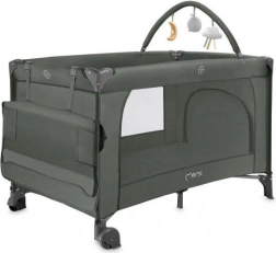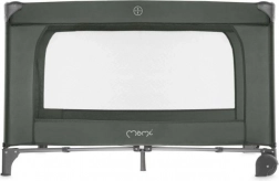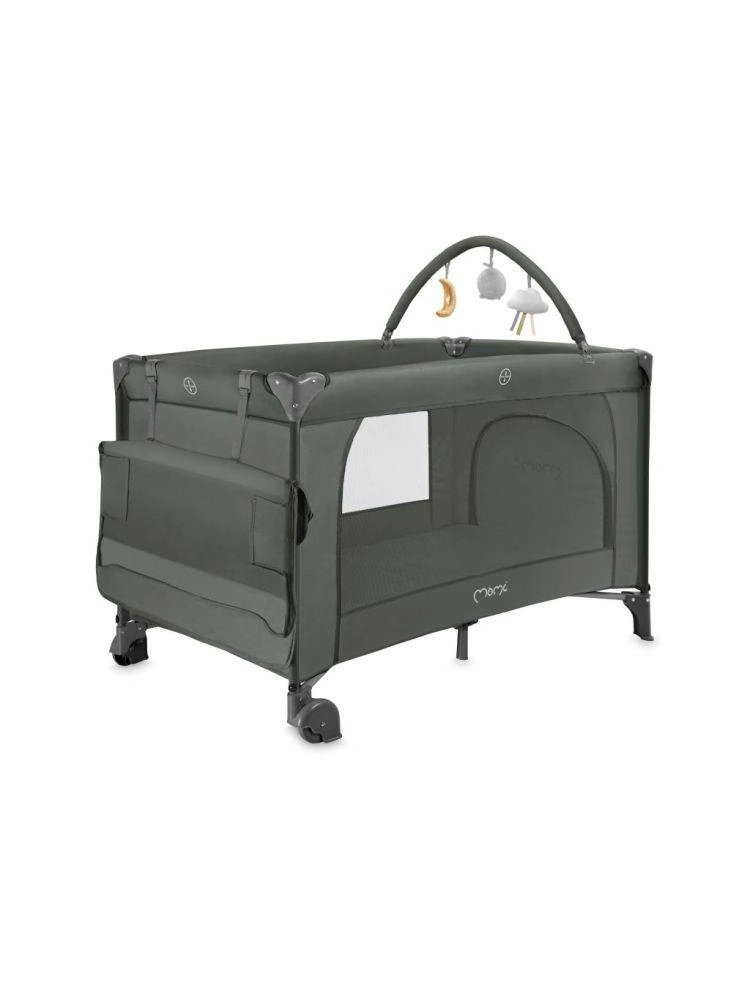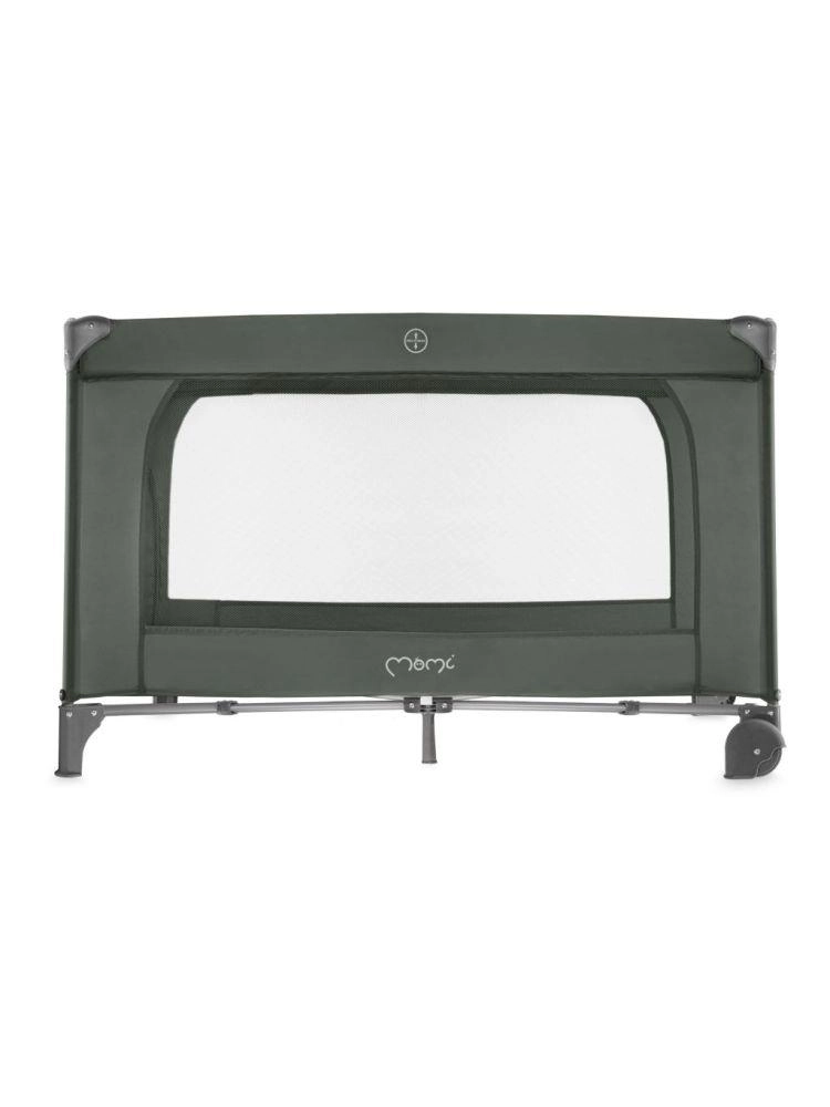 The practical MoMi Belove Plus travel cot in green offers quick folding, two sleeping levels (for infants and toddlers), a side zip entry, and wheels for easy moving. The package includes a mattress, a toy bar, a changing table, and a carry bag – an ideal solution for trips and at home.