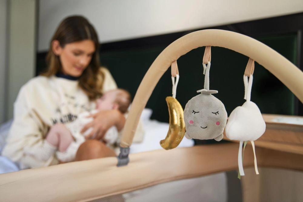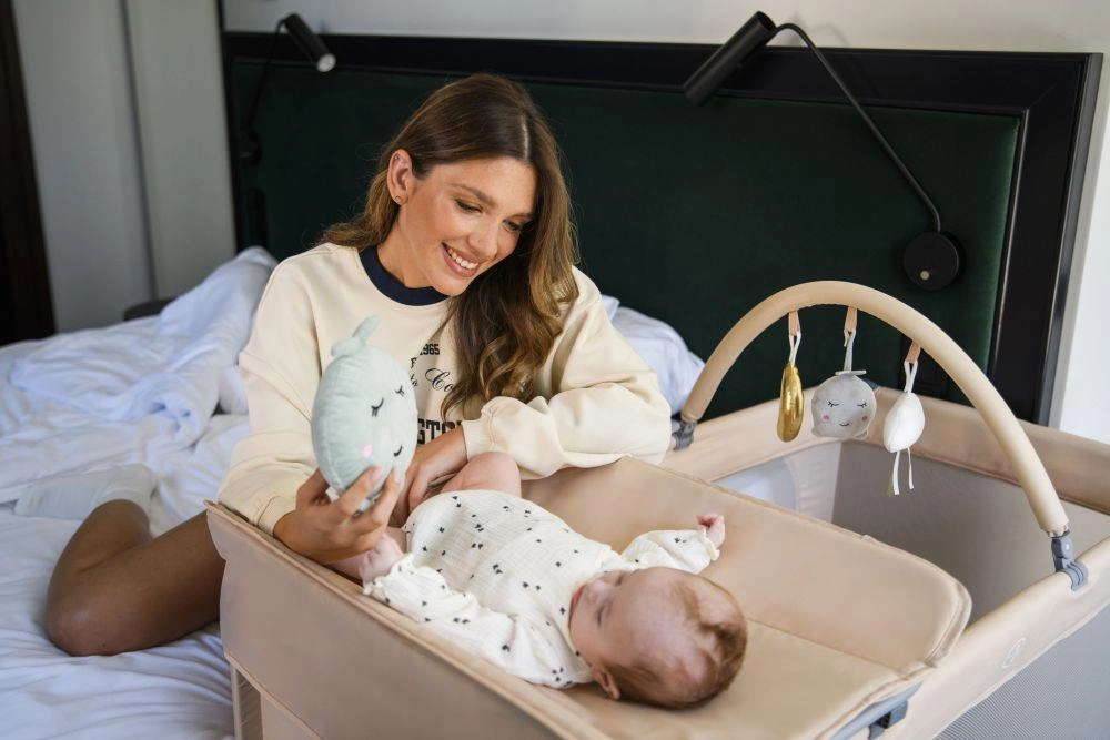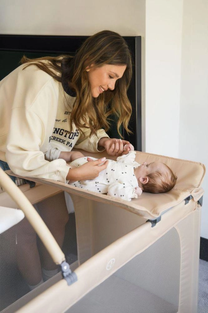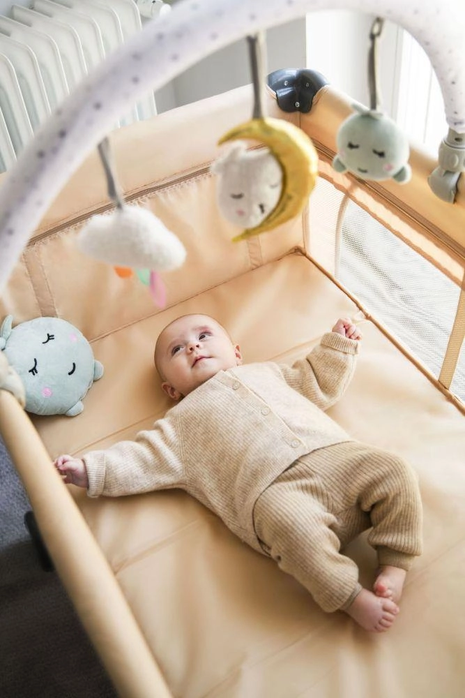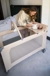 Two sleeping levels support safe sleep from birth: the upper level for newborns up to 9 kg, the lower for toddlers up to 15 kg. The side zip entry delights curious little ones, and the wheels let you move the cot around the room with ease. Included are a soft mattress, a removable toy bar with toys, and a practical changing table for quick changes.