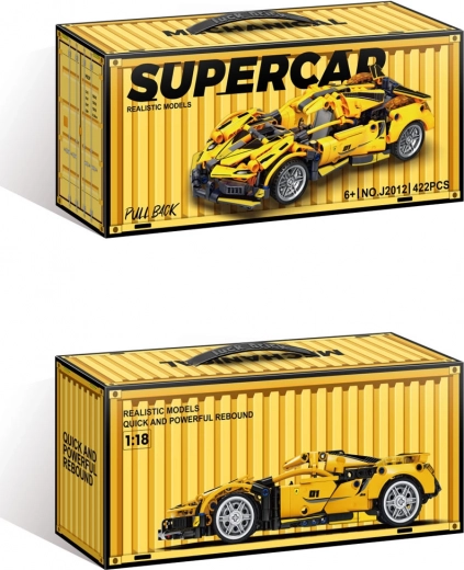 Yellow sports car construction set for children aged 6+ offers 422 pieces, realistic detailing at 1:18 scale, rubber tires, and a fun pull-back drive for speedy rides. Sturdy and durable build, colorful box with handle – a great gift for young builders.