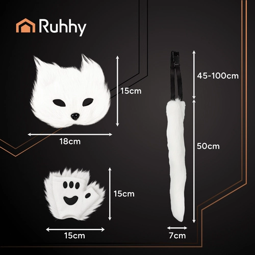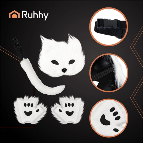 The stylish and playful white RUHHY 4‑in‑1 set is a great choice for cosplay fans, the FURRY/Therian community, and lovers of anime and alternative aesthetics. The elastic strap mask fits comfortably, the long adjustable tail with a flexible wire is easy to shape any way you like, and the paw gloves complete the look. The lightweight construction ensures comfort during long wear.