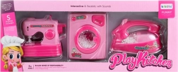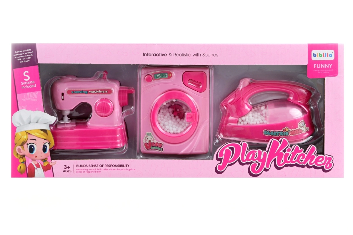 A fun set of home appliances for little helpers with realistic features and safe play. Iron with light and sound, a washing machine with a spinning drum, and a sewing machine that mimics real movement encourage imagination and fine motor skills. Each appliance is powered by 2× AA batteries (not included). Suitable for children aged 3+.