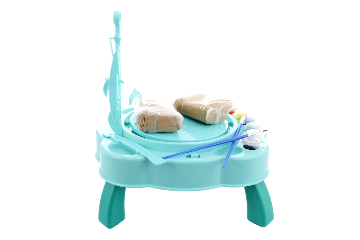 Pottery wheel with legs, 2 bags of clay, 2 brushes, paint palette, instructions, small accessories
