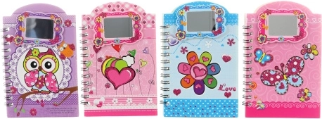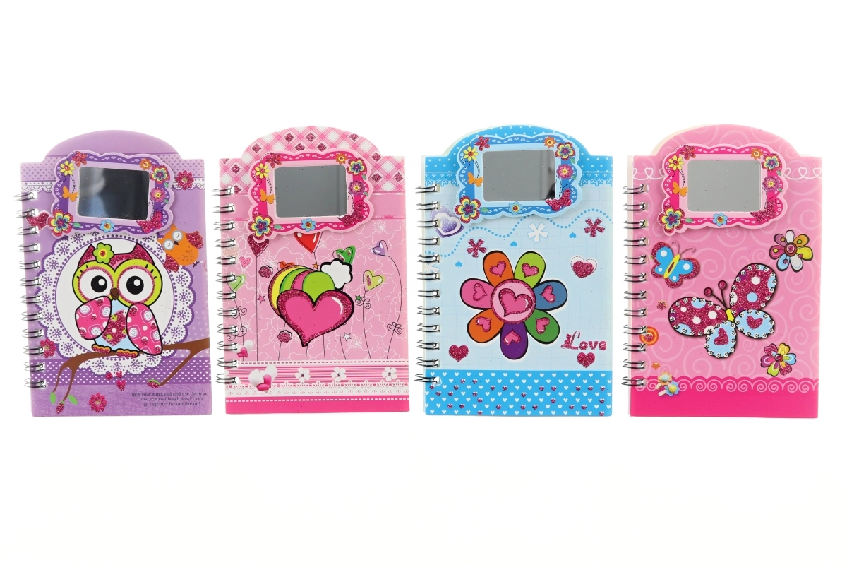 This stylish girls’ notebook is a great companion for notes, diary entries, and small ideas. Decorative motifs of hearts, owls, flowers, and butterflies plus the practical cover mirror make it an original everyday accessory.