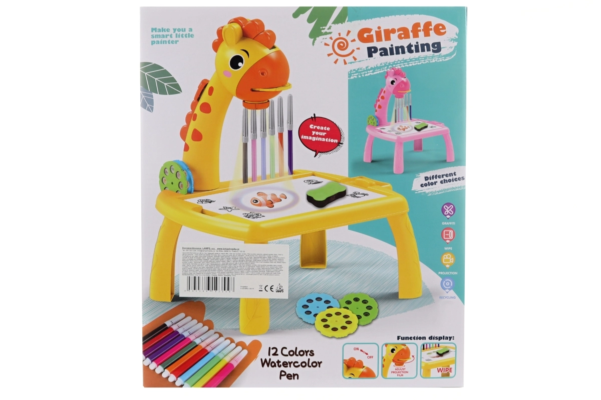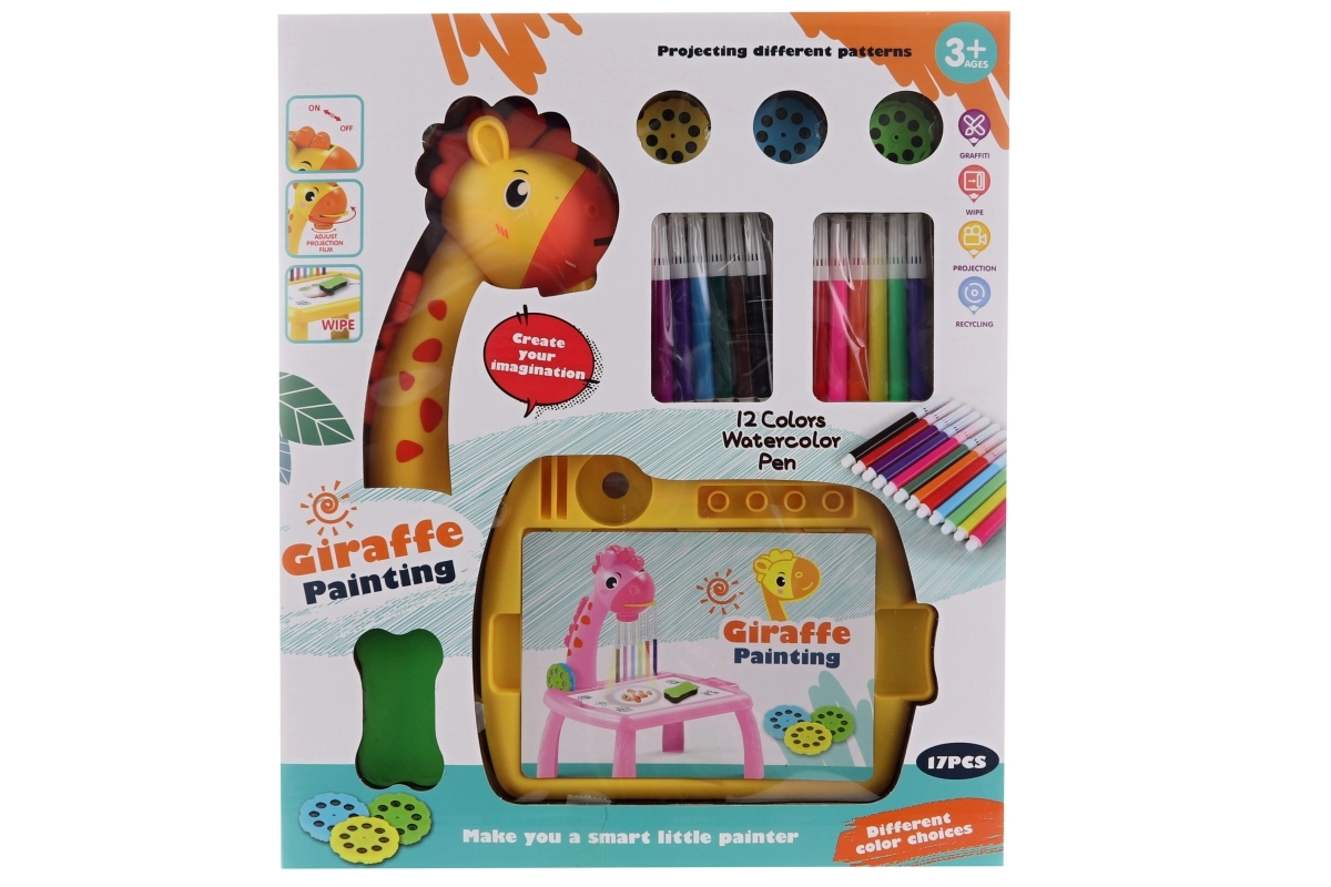 A fun kids' projector in the shape of a giraffe that projects images and boosts creativity. Includes a set of 12 colored markers, a sponge, and 3 image reels. Powered by 3× AAA batteries (not included). Ideal for children aged 3 and up.