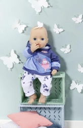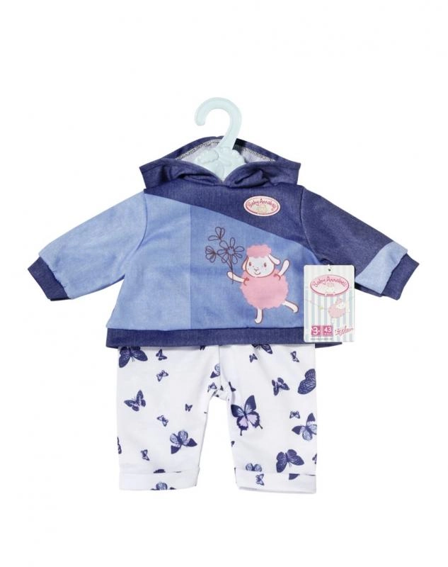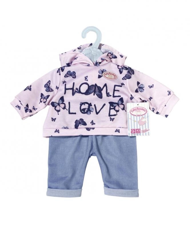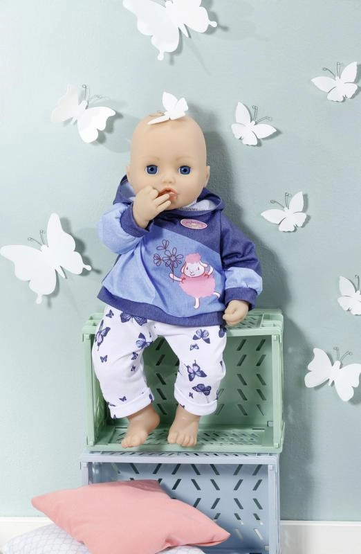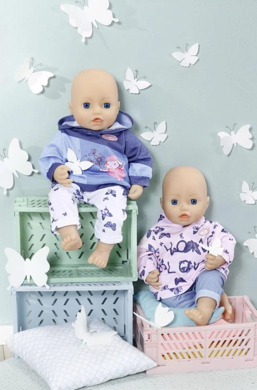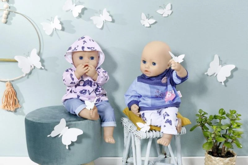 Treat your BABY ANNABELL doll to a cozy home outfit. The set offers two different looks: a pink hoodie with delicate butterflies and denim-style pants, or a blue hoodie with a cute graphic and comfortable sporty pants. The materials are soft and pleasant to the touch, ideal for everyday play.