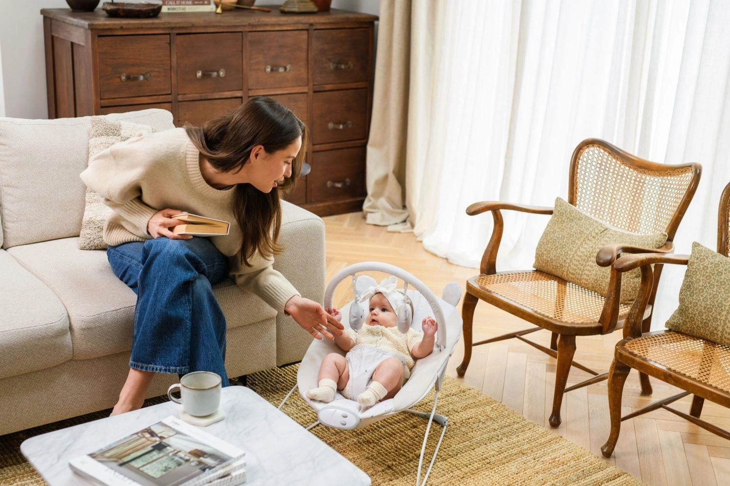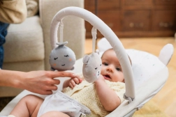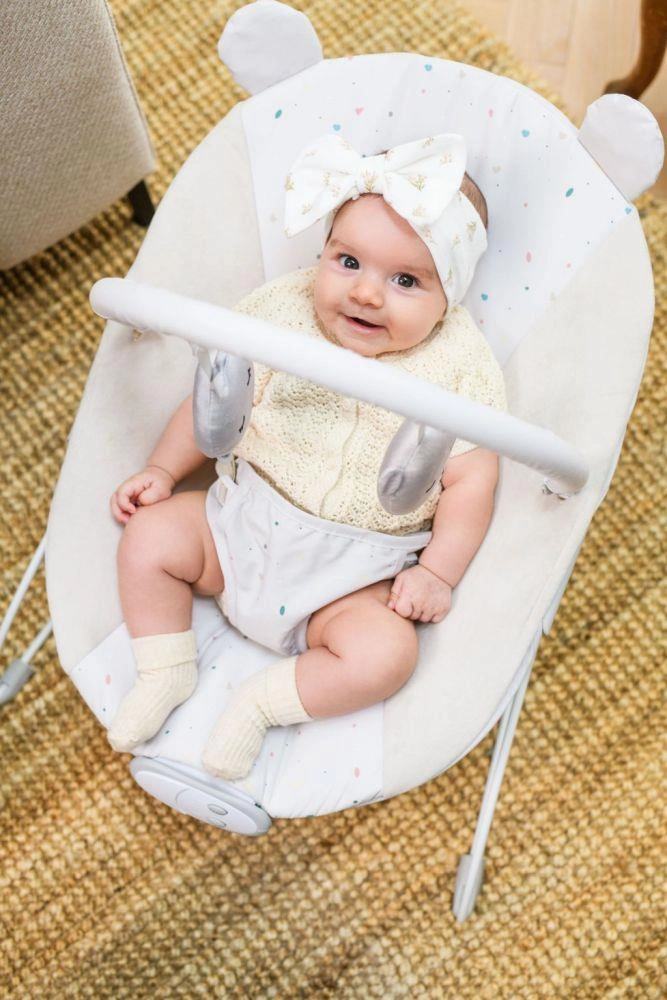 It includes a removable toy bar with two toys that support sensory development and motor coordination. The cover can be easily removed and washed, keeping the bouncer hygienically clean. Thanks to its lightweight and compact design, you can move it around the home with ease.