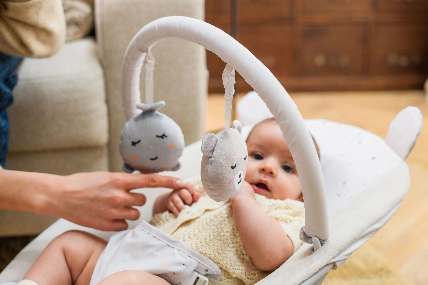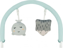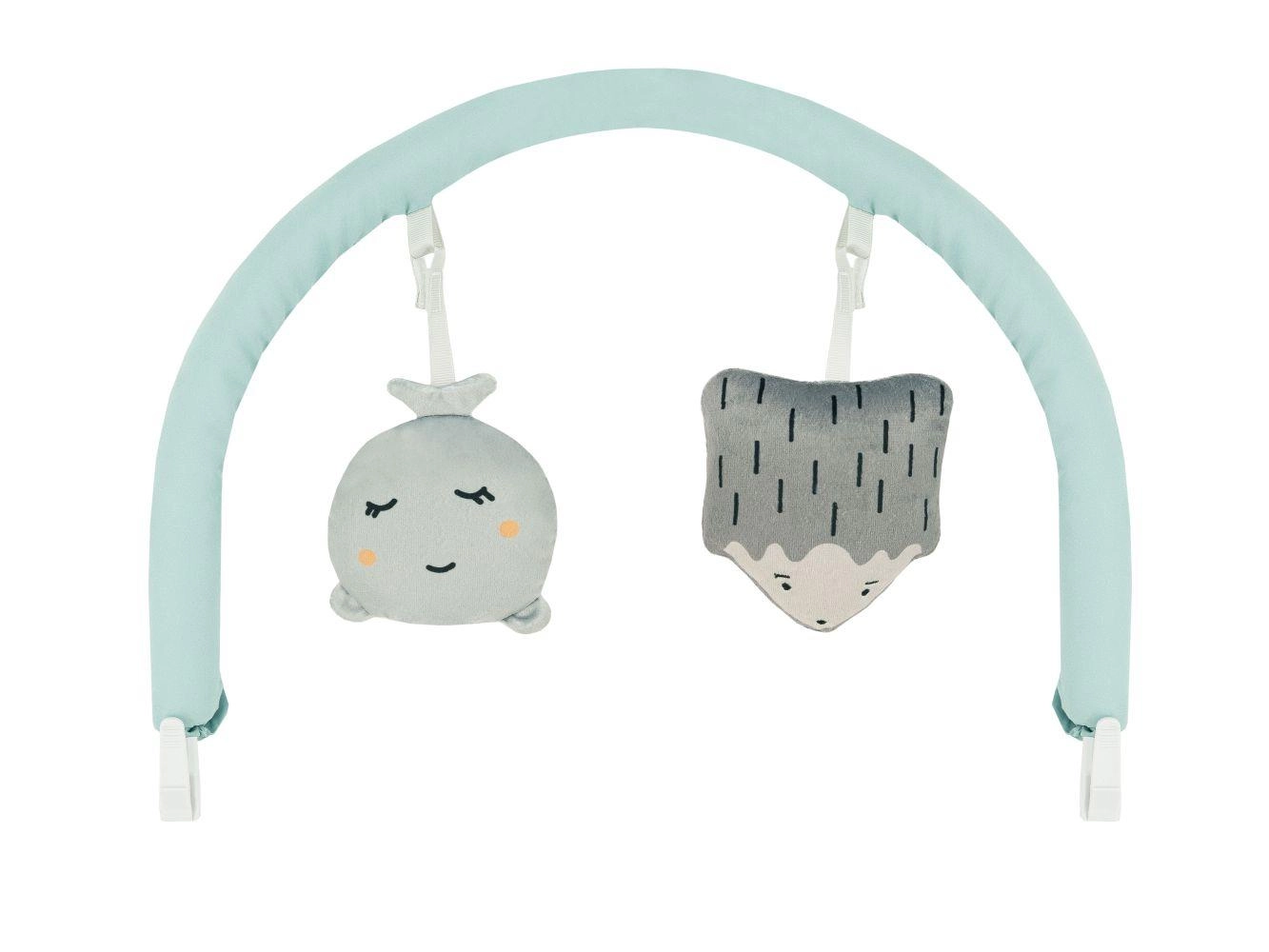 The removable toy bar with two soft toys supports visual tracking, grasping, and hand–eye coordination.
