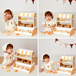 A cute wooden mini bakery from VIGA turns a kids’ room into a small shop. The set includes a stand with a striped canopy, 16 wooden accessories, and functional tongs and serving tools for authentic shopkeeper or baker play. It supports the development of motor skills, creativity, and social skills, and thanks to its sturdy wooden construction it provides hours of fun.