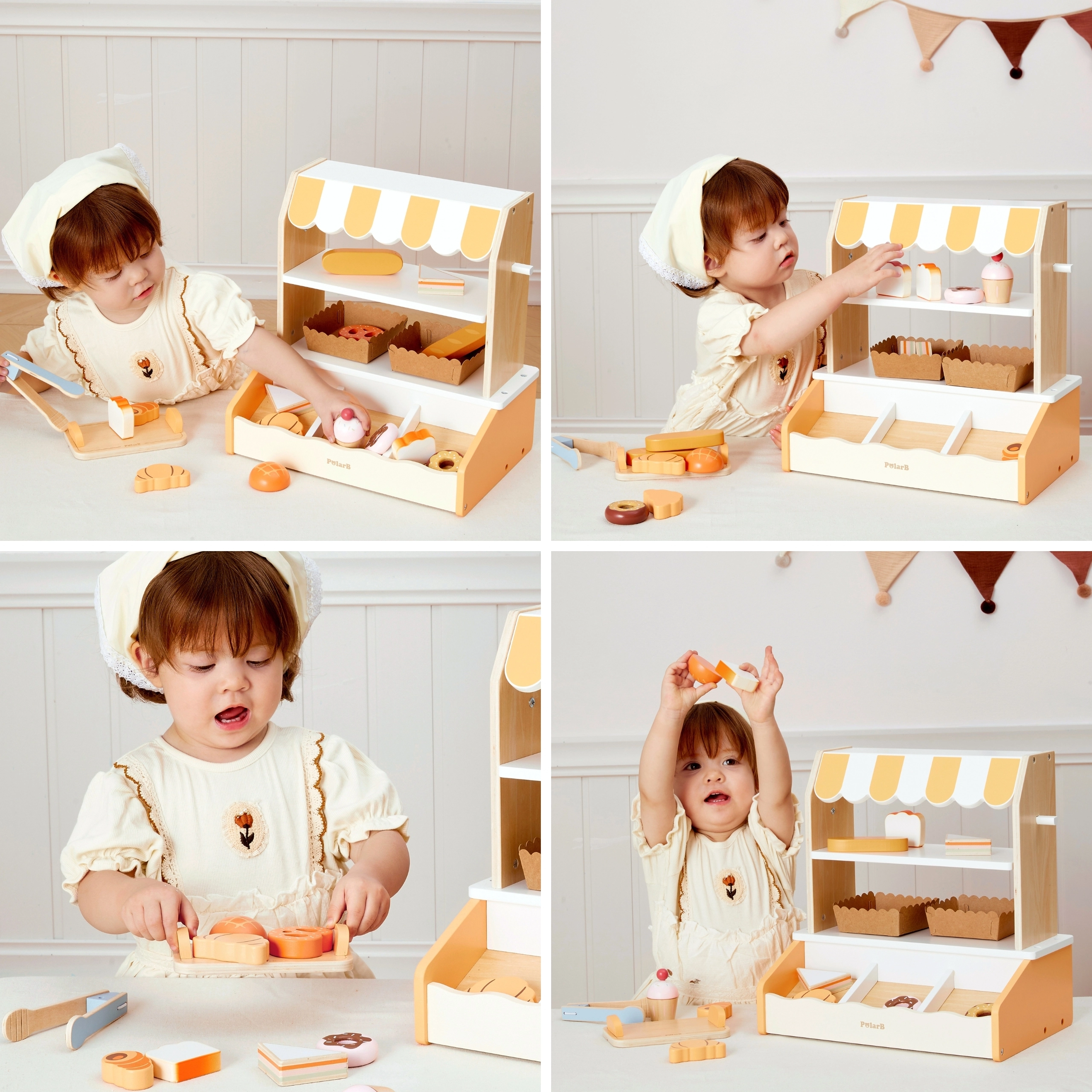 This stylish wooden mini bakery brings kids a realistic shop play experience — with two display shelves, compartments for bread, and little treats for sorting and serving. Thanks to its compact dimensions and soft pastel colors, it fits beautifully in any children’s room.