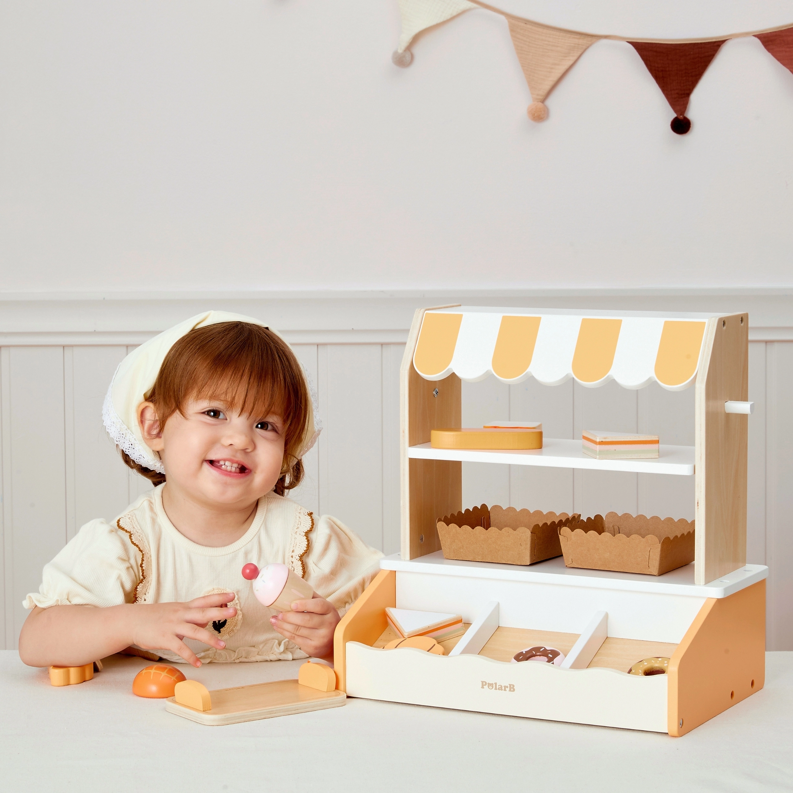 The stand with a striped canopy, shelves, and compartments lets you neatly display baked goods and easily “serve” customers.