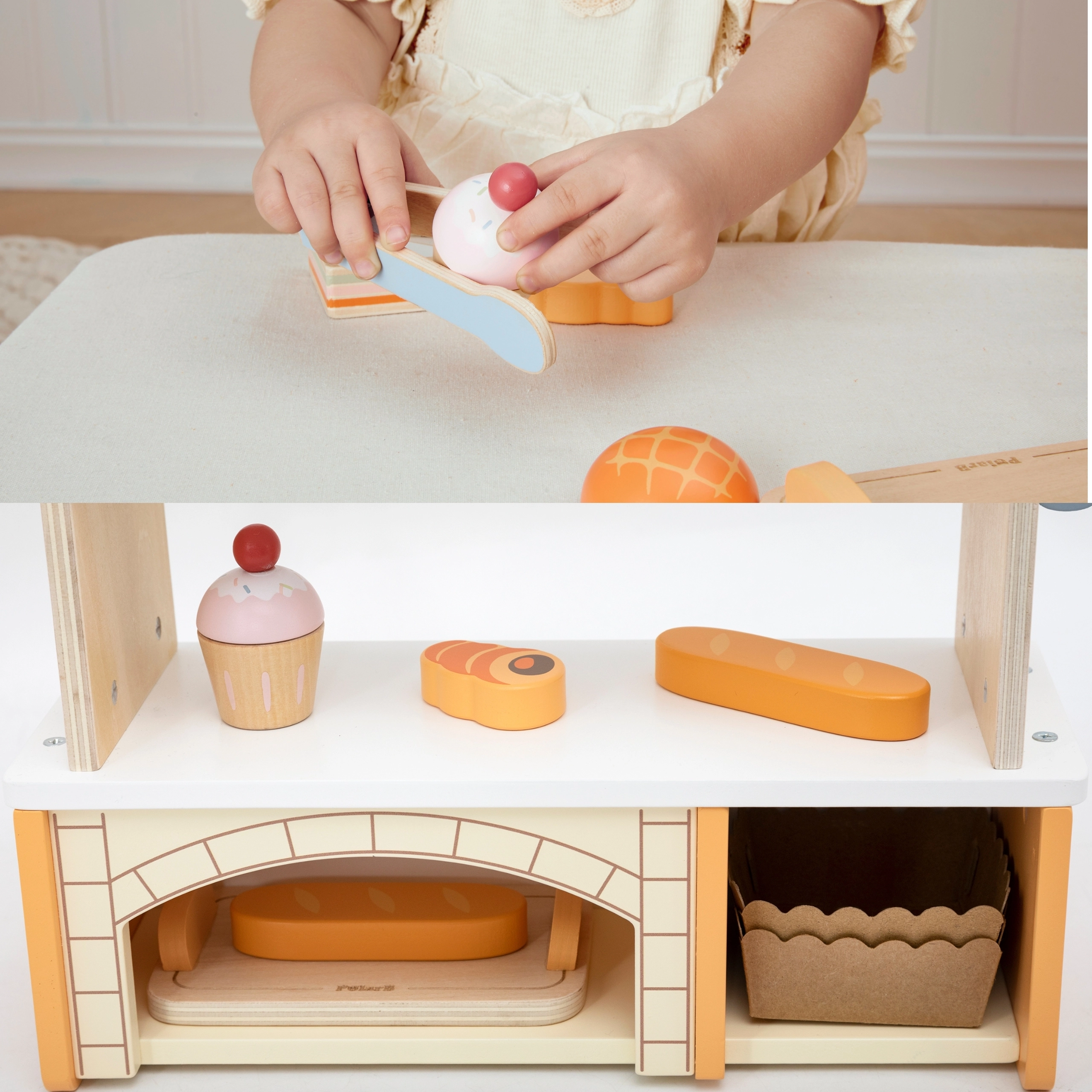 The set includes a generous selection of baked goods and tools: a tray, tongs, paper baskets, and various wooden treats (croissants, donuts, baguettes, toast, pretzel, muffins, and more). Play naturally develops fine motor skills, hand–eye coordination, communication, and confidence while serving “customers.”