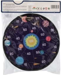 One side of the target is designed with attractive colors and numbers for a traditional game, while the other side introduces a space theme with images of planets. Kids can practice math by adding up the points from each throw.