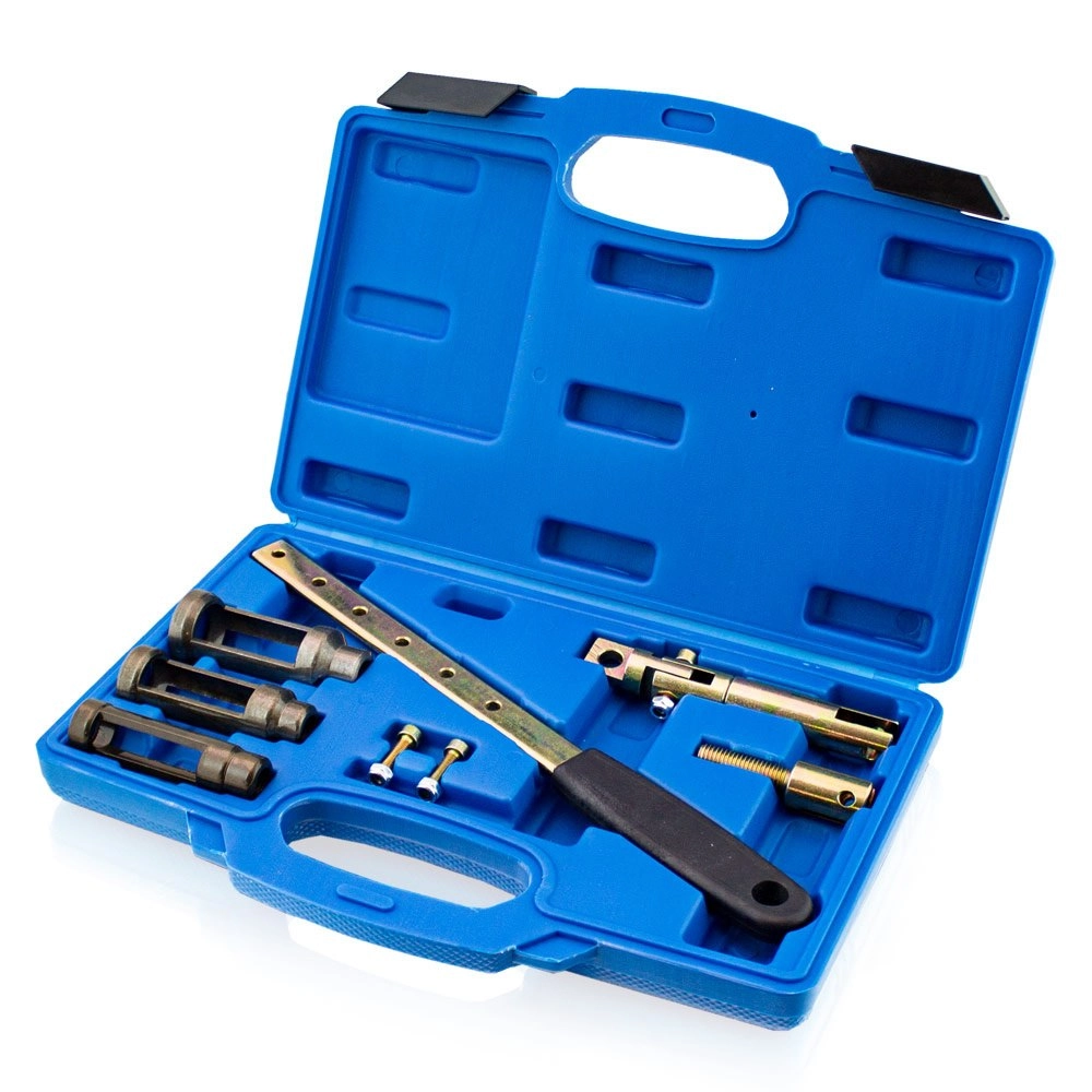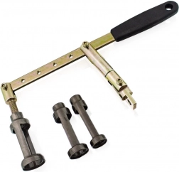 Thanks to its robust construction and adjustable arm, the tool offers stability, precision and long service life. The three included ends—20 mm, 26 mm and 35 mm—cover a wide range of valve spring sizes. The entire set is stored in a durable case for easy transport and organized storage.