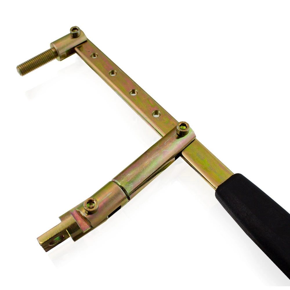 This universal valve spring compressor allows you to safely and precisely compress the spring and release the valve keepers, so you can perform a valve stem seal replacement without removing the cylinder head. An ideal choice for workshops and DIY mechanics seeking an efficient and reliable solution for 8V, 12V and 16V engines with overhead camshaft (OHC).