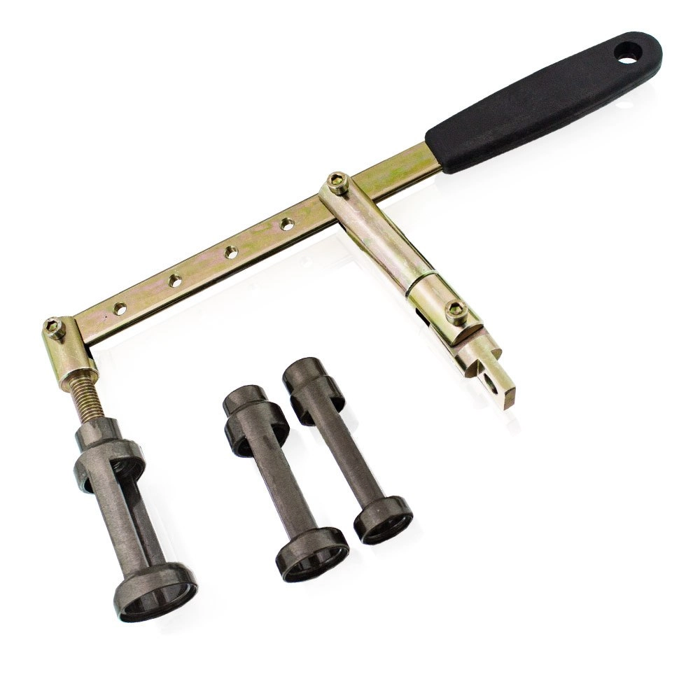 A professional valve spring compressor for 8V, 12V and 16V engines that makes service easier without removing the cylinder head. It offers a fast replacement of valve stem seals, wide compatibility with OHC valvetrains, and a durable construction. Includes a practical plastic case and three interchangeable ends 20/26/35 mm.