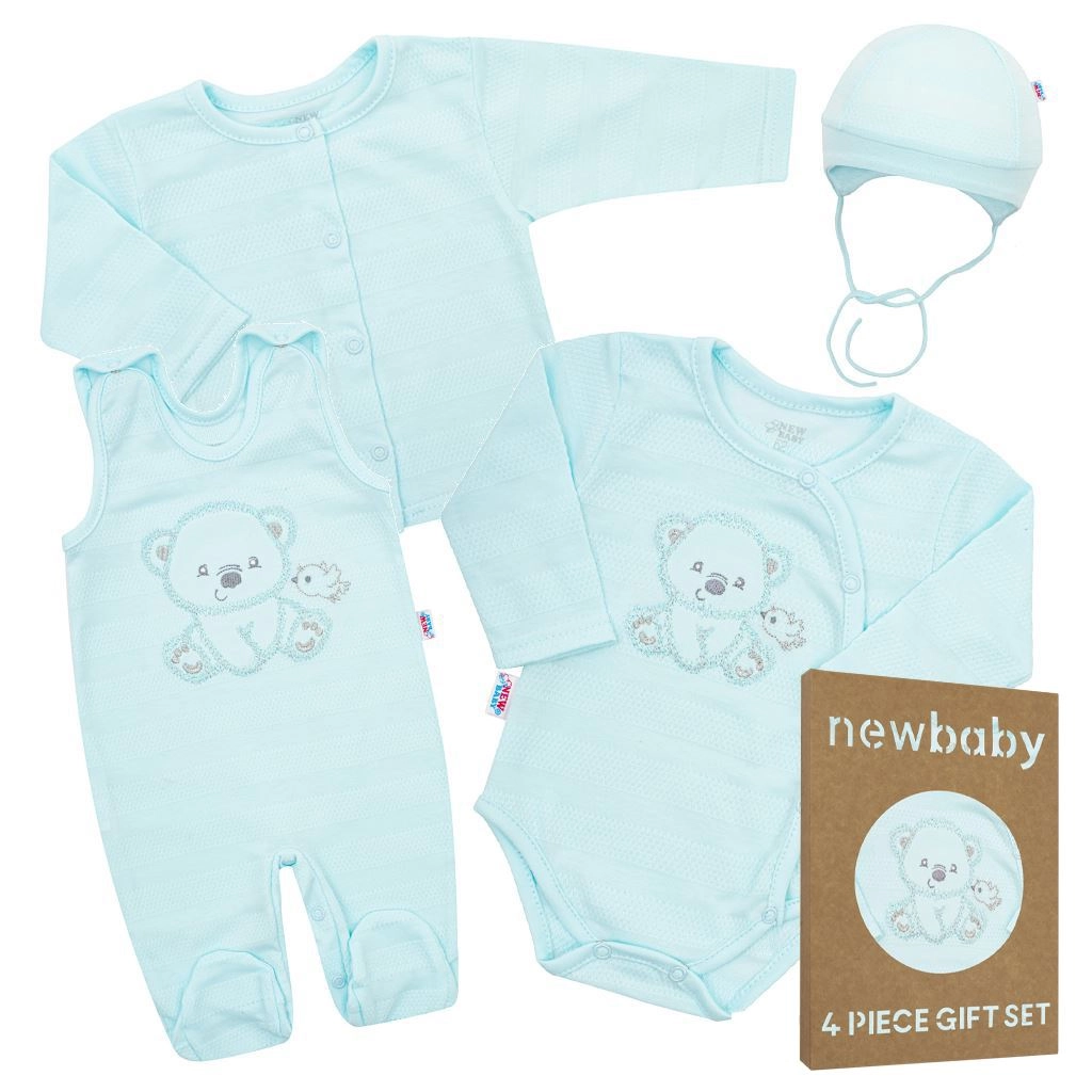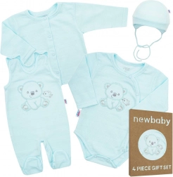 A practical and gentle set for a newborn includes 4 soft cotton pieces for the maternity hospital and the first weeks at home: a full-snap long-sleeve bodysuit, footed romper, snap cardigan, and a tie-on hat. Made of 100% cotton with a cute bear and bird embroidery, delivered in an eco gift box – ideal as a present for new parents.