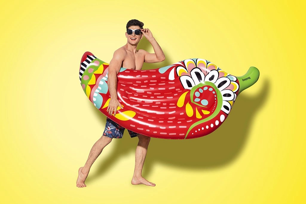 Enjoy summer to the fullest with the lightweight and playful Bestway inflatable lounger shaped like a chili pepper. Thanks to its vivid graphics, two air chambers, and sturdy I-beam construction, it offers excellent stability and comfort by the pool, on the lake, or at the beach. A safety valve makes inflating and deflating easy, and the compact size is ideal for convenient storage and transport.