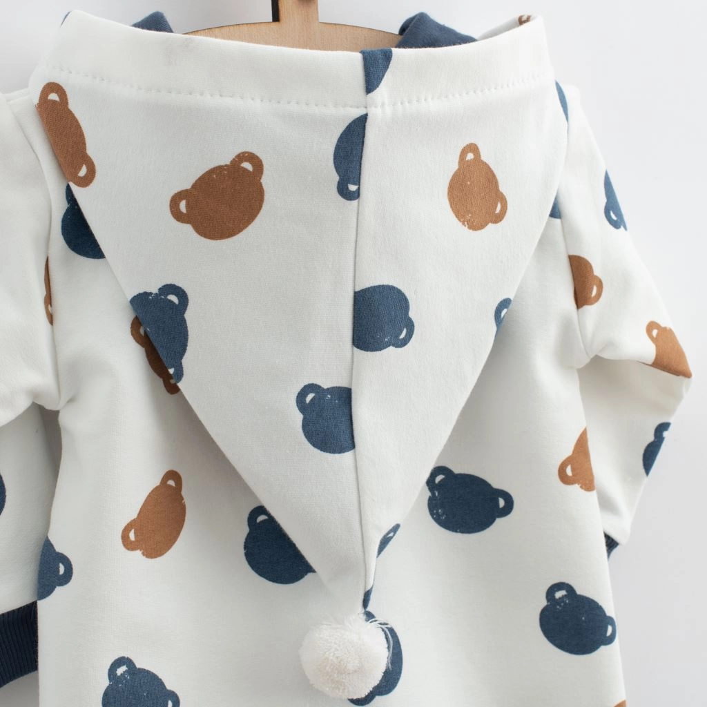 A cute and practical baby hooded overall from the New Baby Little One line delights with both comfort and design. It features an all-over bear print, a full-length zip fastening, stretchy cuffs on the sleeves and legs, and soft sweatshirt fabric suitable for year-round wear.