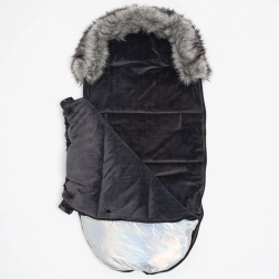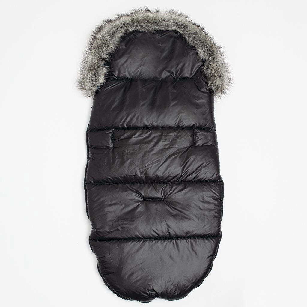 Stylish and cozy footmuff for babies suitable for strollers, car seats, and sleds. It offers a luxurious glossy design, removable faux fur trim, a zipper around the entire perimeter, and openings for 5-point harnesses for maximum safety and comfort.