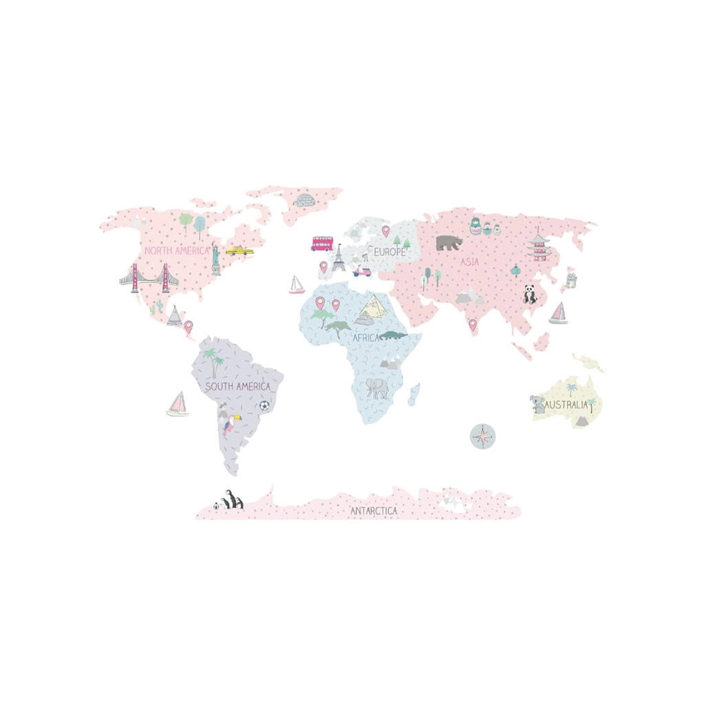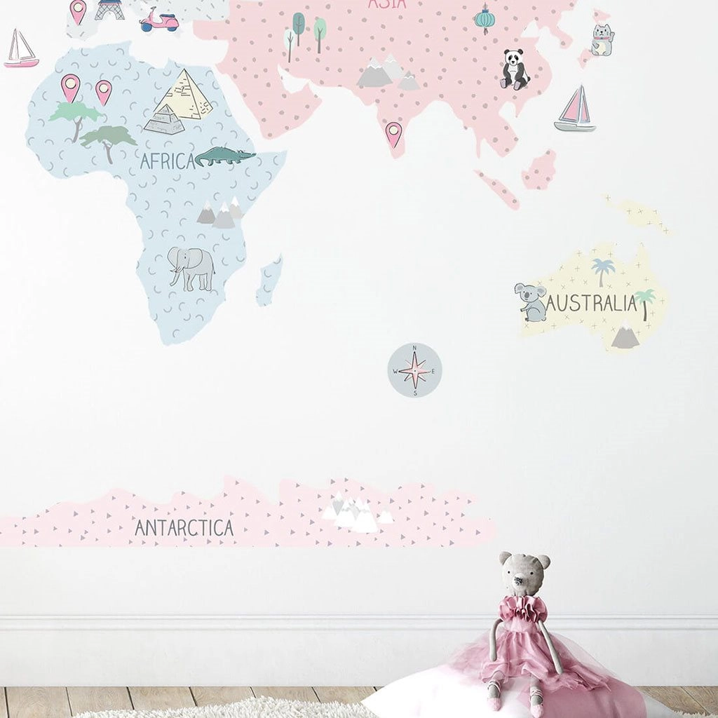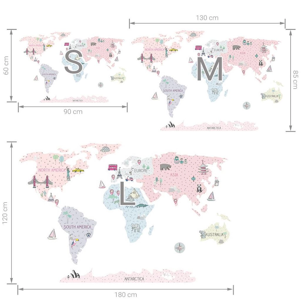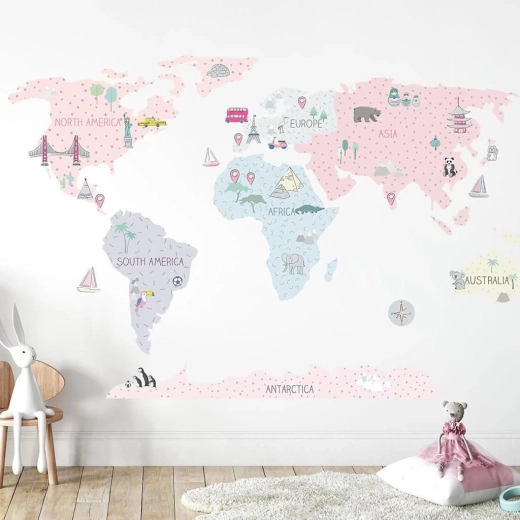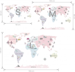 Discover the magic of learning through play with the beautiful World Map L wall sticker in pink pastel tones. This Scandinavian-style decor brightens any kids’ room, adds educational elements (continents, oceans, compass directions, landmarks), and thanks to the matte laminate it is scratch-resistant and easy to apply. Each element is cut separately for easy application, even in larger spaces.