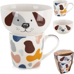 A cute breakfast set for kids includes a porcelain bowl and mug that, when stacked, create a dog image. Ideal for everyday use – for cereals, soups, and drinks. High-quality porcelain, dishwasher- and microwave-safe, and an ergonomic mug with handle ensure comfortable and safe use for children aged 3 and up.