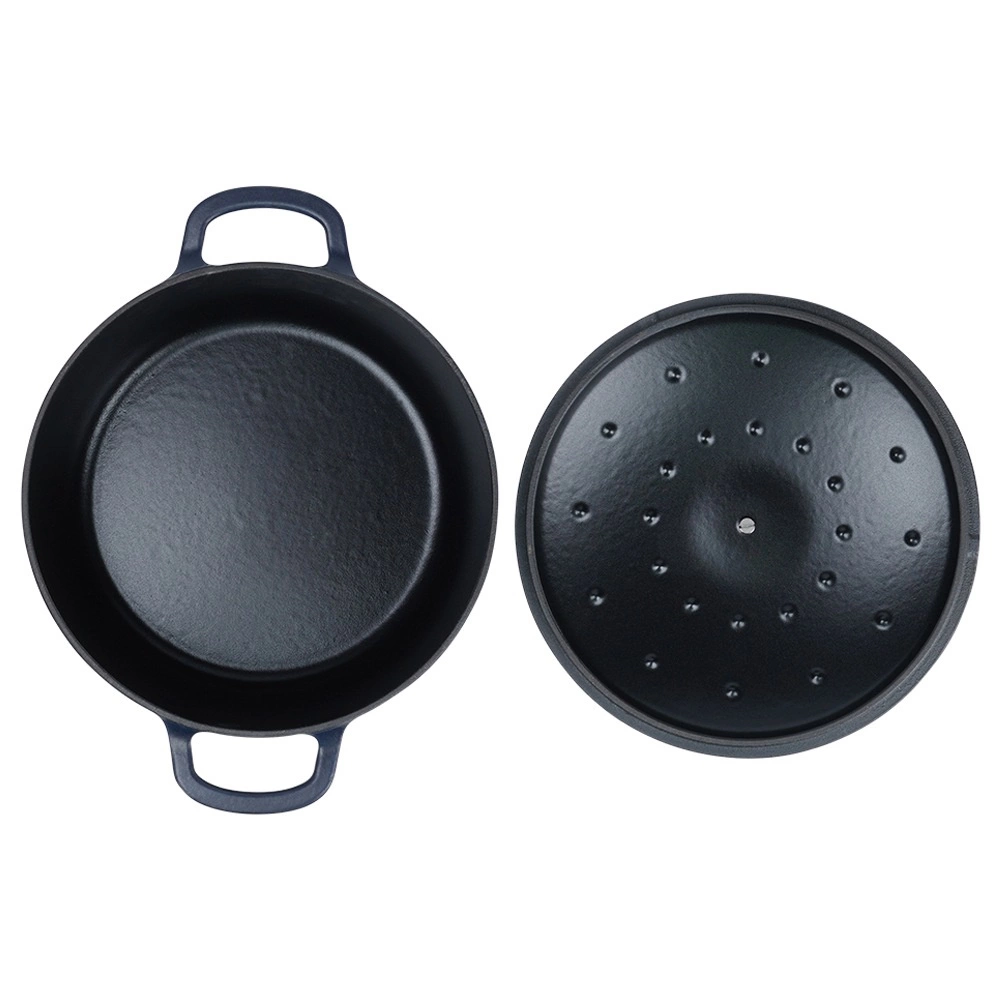 Heavy-duty cast iron with a weighty lid distributes heat evenly and holds it for a long time—ideal for stews, roasts and slow braising without drying out.