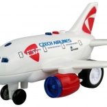 A realistic children's airplane licensed by CSA delights young pilots with authentic captain and flight attendant announcements, light effects, and a simple friction motor. An ideal toy for kids who love airplanes and want to experience a takeoff, flight, and landing like on a real aircraft.