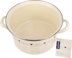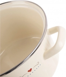 Stylish enamel pot TONCA with a 4 l capacity and 22 cm diameter in a cream color with a subtle heart motif is ideal for everyday cooking and braising. It has sturdy ergonomic handles, a stainless steel rim, and is suitable for all types of cookers including induction as well as for the oven. For easy care, you can wash it in the dishwasher.