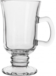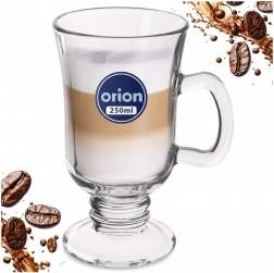 An elegant 250 ml latte glass with a stable stem and a comfortable handle, ideal for serving latte, cappuccino, tea, and mulled wine. Made from durable clear glass, suitable for everyday use at home and in gastronomy, and dishwasher safe.