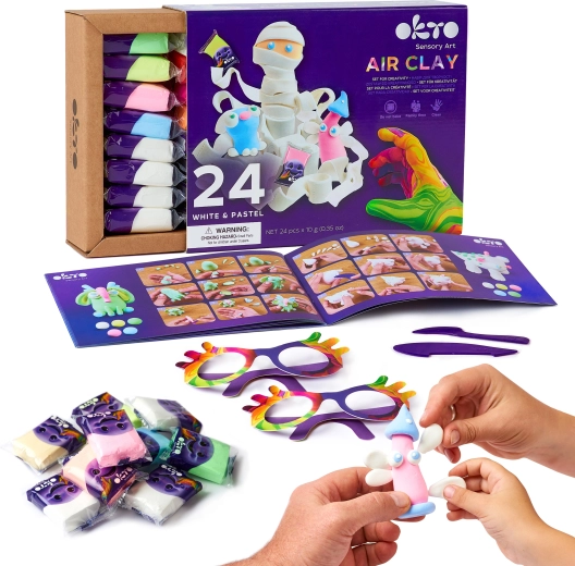 The OKTO set brings everything you need to start creating right away—from a vibrant color palette to useful tools and instructions. The clay is lightweight, pleasant to the touch, and ready to use once opened. After shaping, simply let your creations air dry.