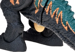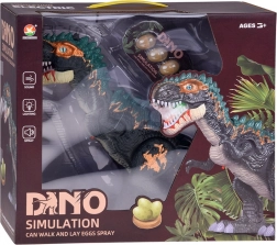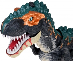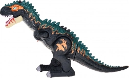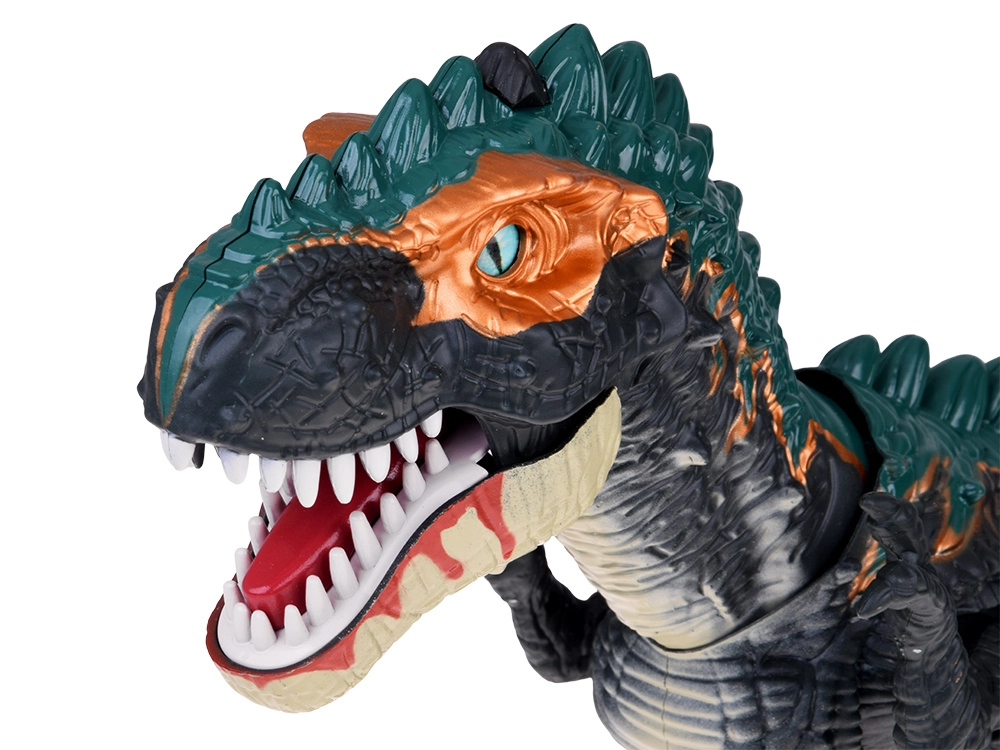 The large model of the most famous dinosaur, the T‑Rex, impresses with detailed design: prominent teeth, realistic eyes, skin‑like surface texture, claws, and dorsal spikes. When switched on, the T‑Rex walks forward, moves its head, front legs, and tail, and emits an imposing roar.
