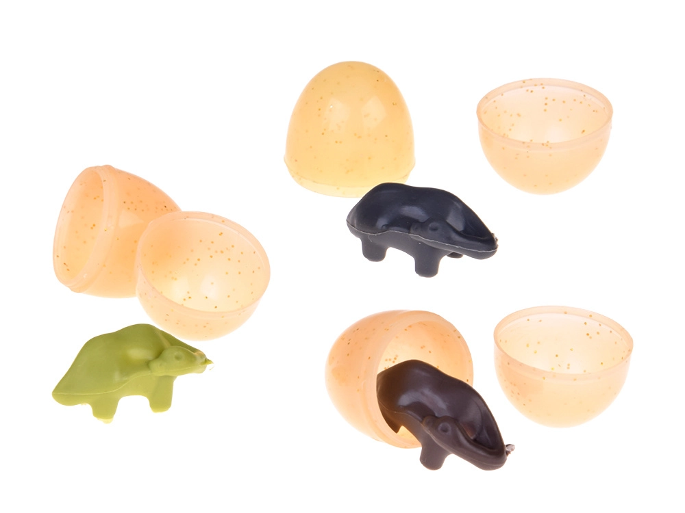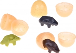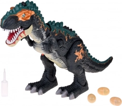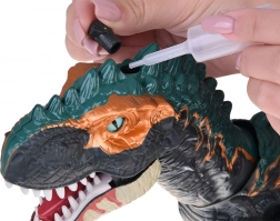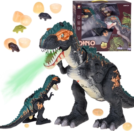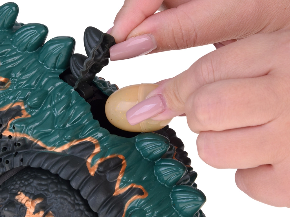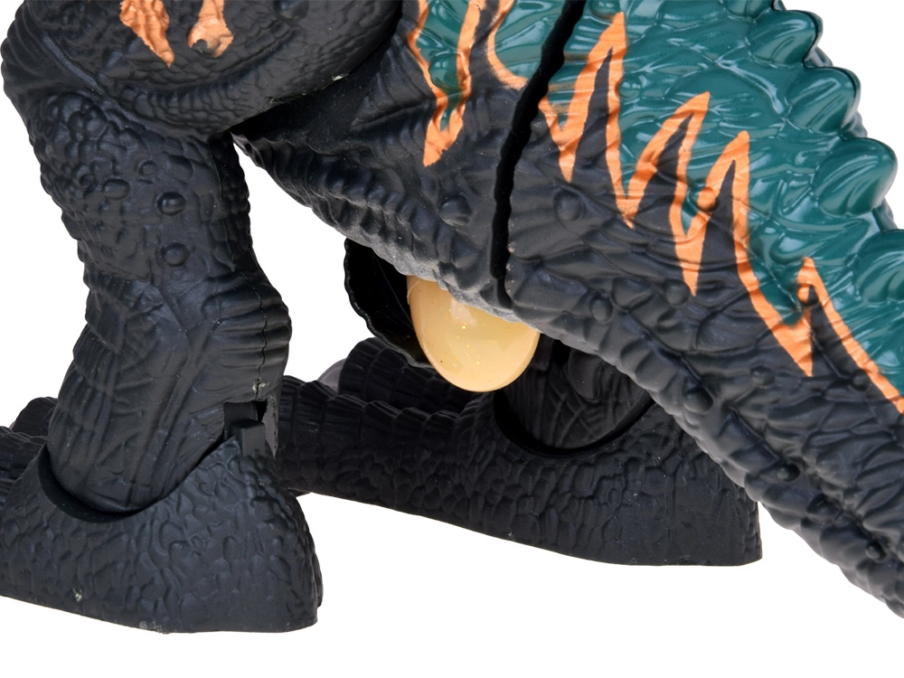 Unique steam effect: under the black tip on the head is a water tank. After filling it with the included bottle, the dinosaur releases steam from its mouth, illuminated by an LED for a stunning visual effect. There is an opening on the back for inserting eggs – the T‑Rex will then “lay” them. The package includes 3 opening eggs with collectible baby dino figures.