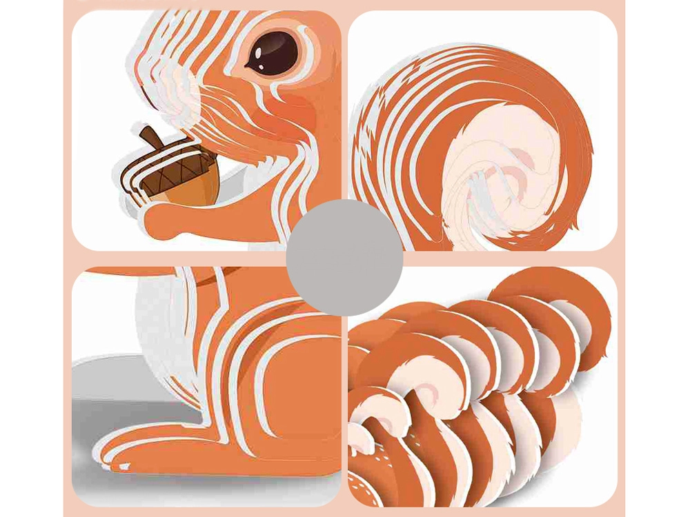 Discover a fun construction set that lets kids easily assemble a three-dimensional squirrel figure. The pieces are made from a lightweight, safe cardboard material and, thanks to precise shaping, they snap together easily without glue. Even younger builders can assemble it by following the instructions on the packaging.