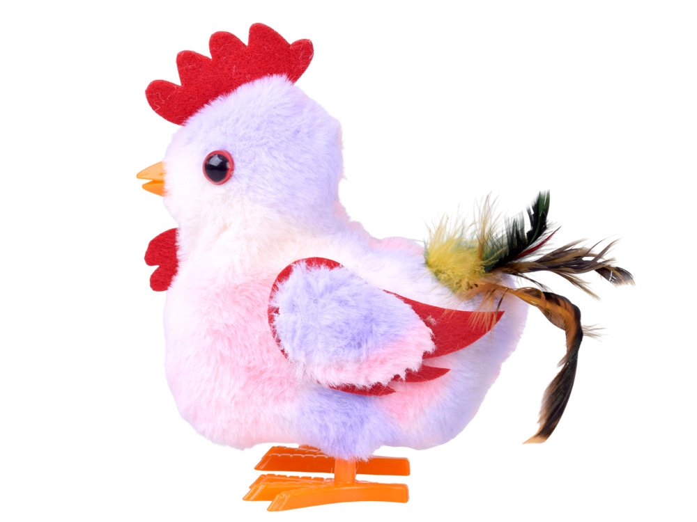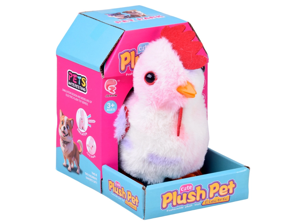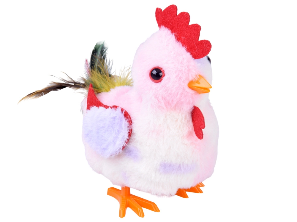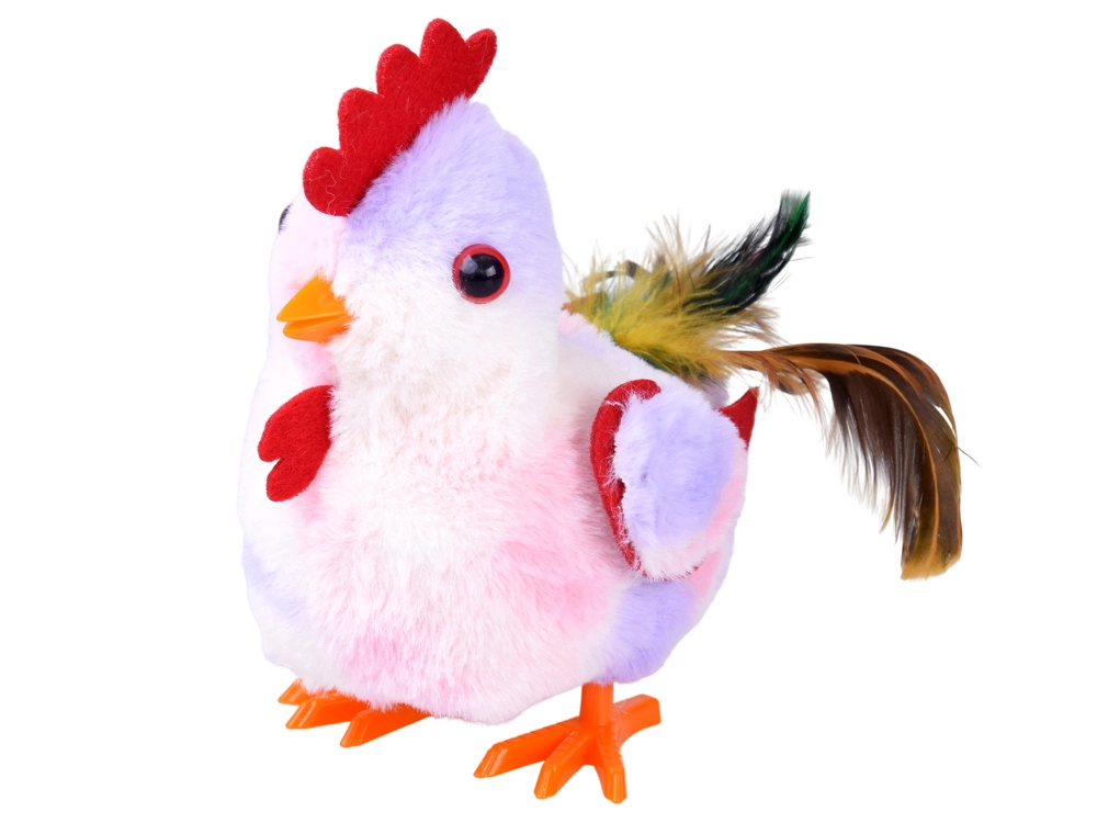 Simply insert two AA batteries under the belly and slide the red switch to “ON.” The chicken will: