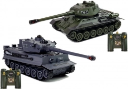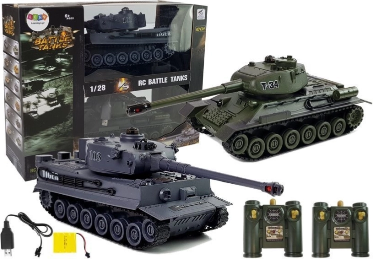 A two-piece set of 1:28 scale RC tanks brings realistic battles at home and outdoors. The T-34 and TIGER 103 replicas offer a rotating turret, infrared battles with decreasing lives, simple forward/reverse and turning control, and 4.8 V battery power. An ideal gift for young and adult military tech fans.