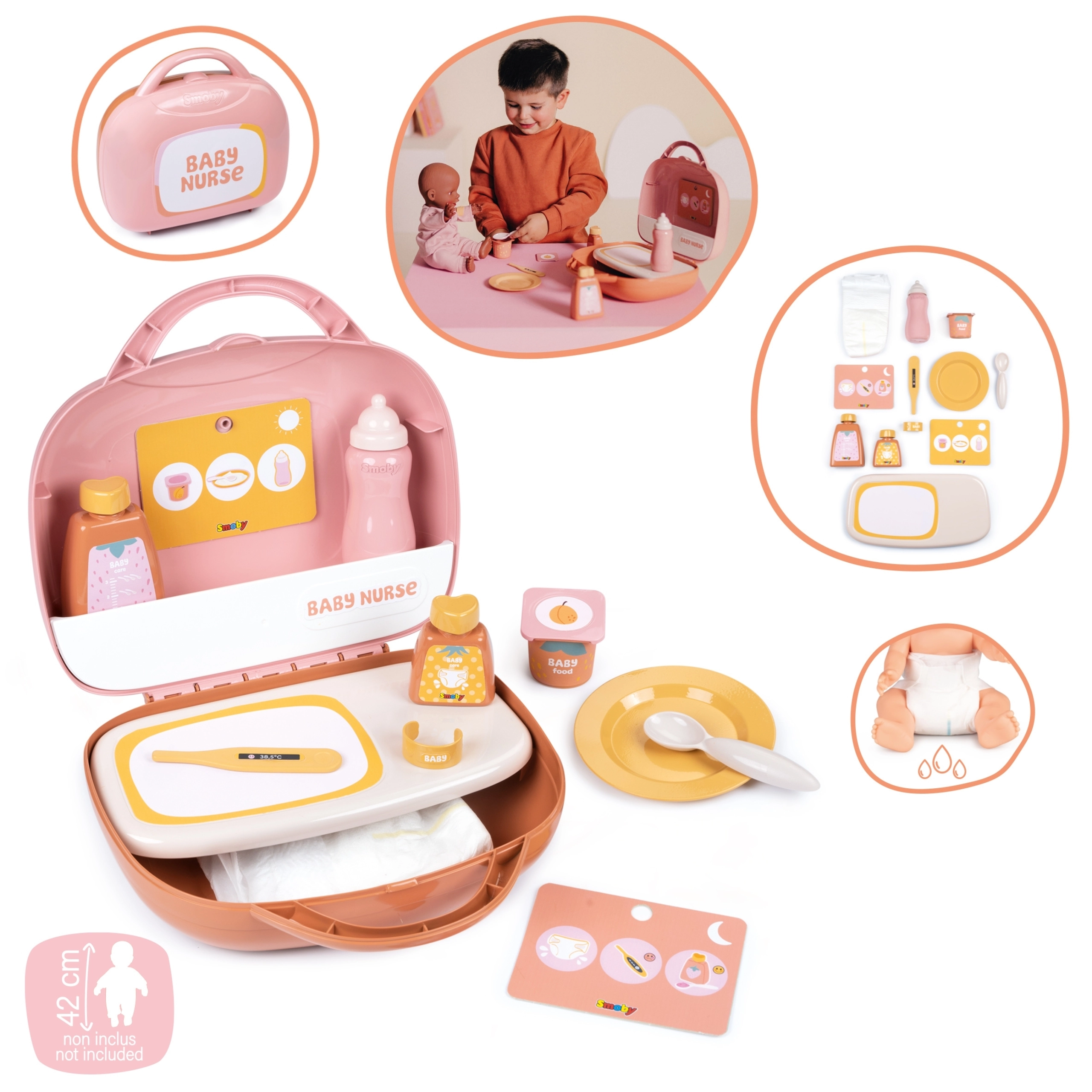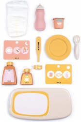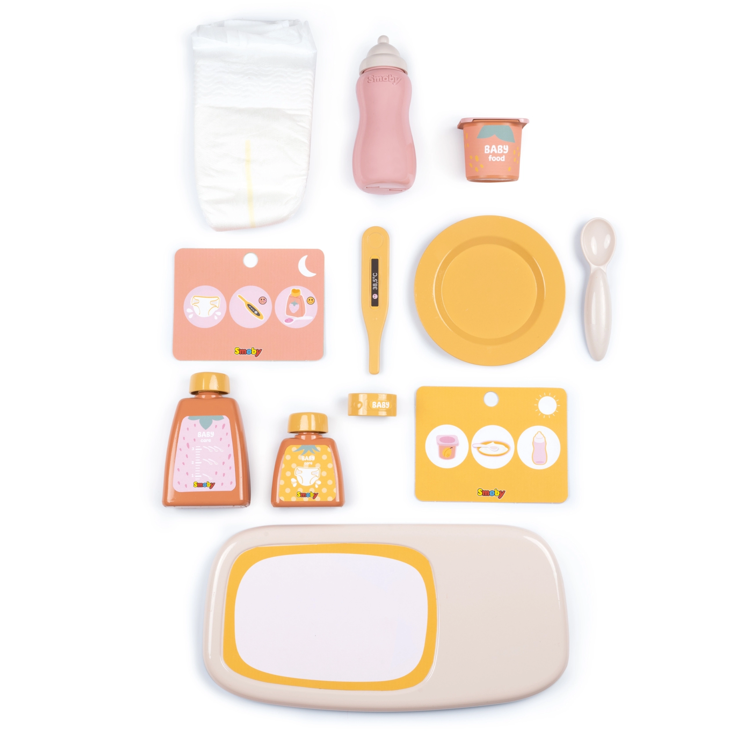 From a bottle, plate, and spoon to a thermometer and diaper, plus day and night routine cards—everything for authentic feeding and care play.