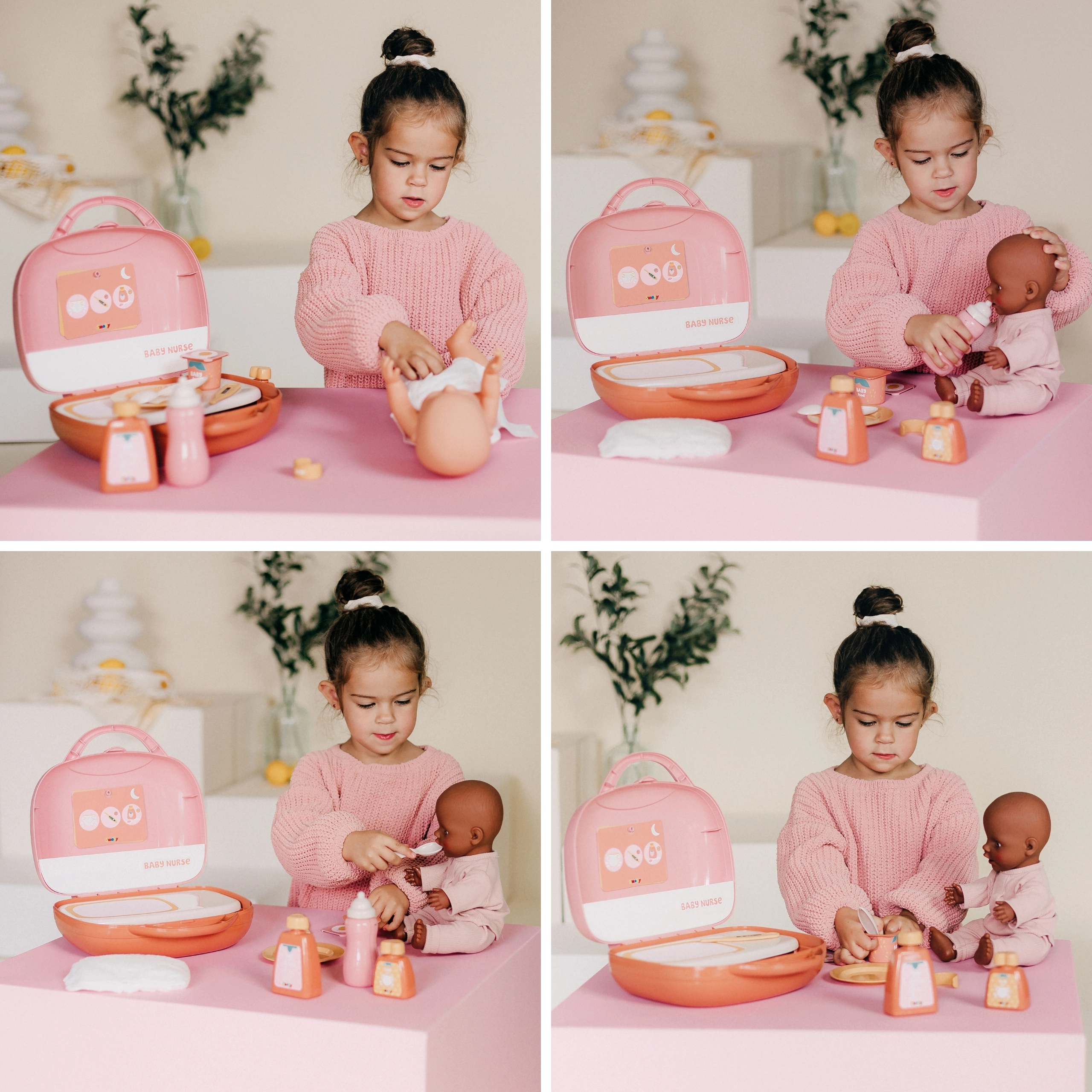 The Baby Nurse set in a practical case offers everything little caregivers need to imitate real baby care. Kids can feed the doll (not included) with a bottle, serve “yogurt” on a plate, check the temperature with a thermometer, and use cosmetic bottles for pretend hygiene. Thanks to the day and night routine cards, they learn to create care routines and rituals.