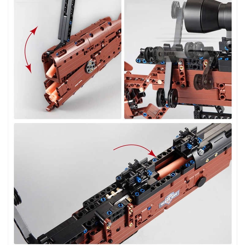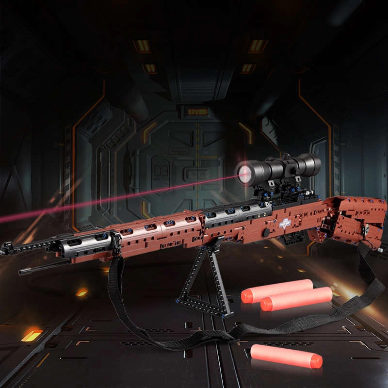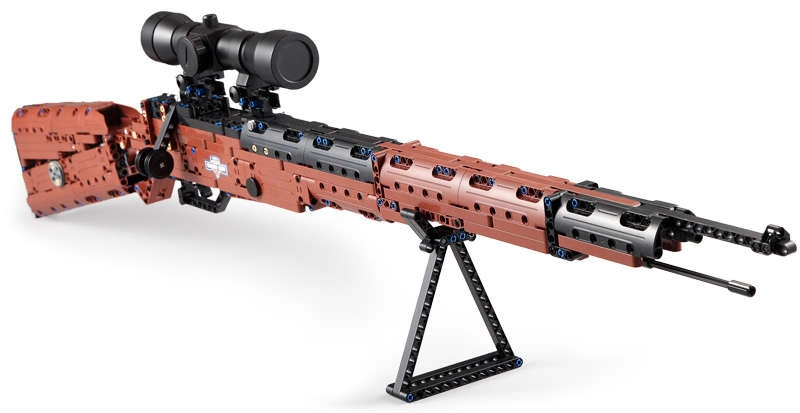 The long barrel, optics, panel parts, and technic connectors create a faithful replica that stands out on any shelf.