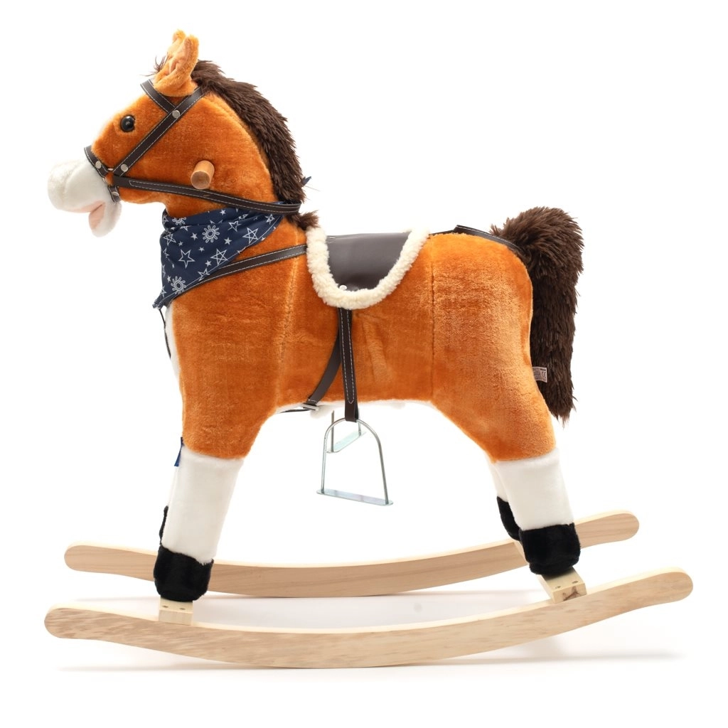 A solid wooden base, sturdy bridle, metal stirrups, and a soft leatherette saddle provide confidence and comfort while rocking.