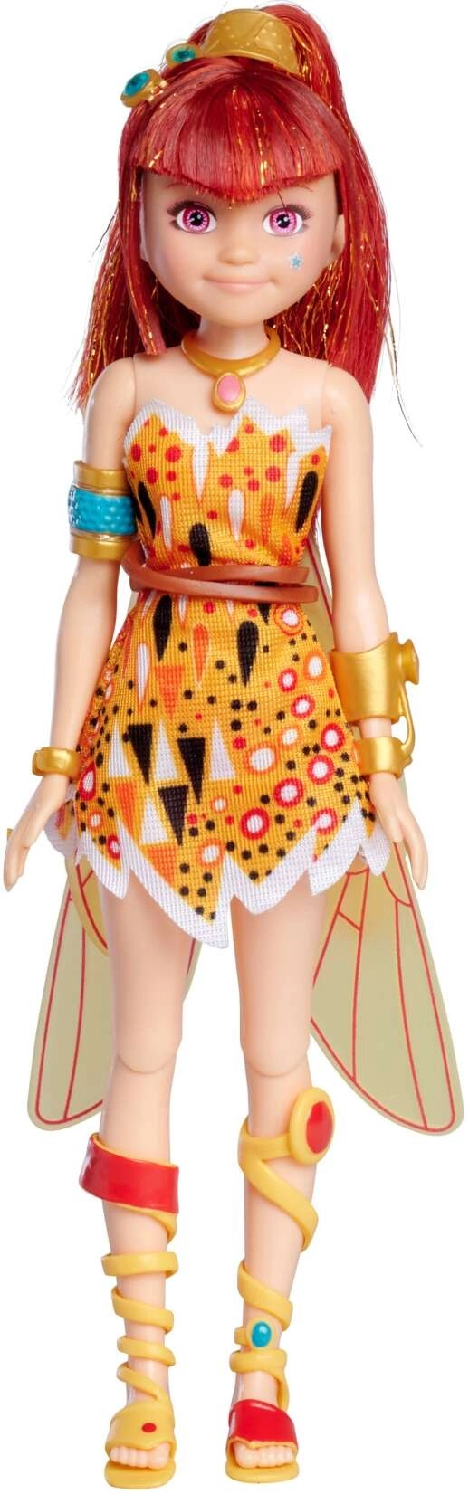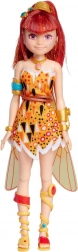 The Yuko doll is faithfully inspired by the heroine from the magical world of Centopia. She has large pink eyes, fiery red hair tied into a high ponytail with a golden clip, and the signature blue star on her face. She wears an orange dress with a multicolored pattern and stylish accessories — a gold necklace with a pink stone, bracelets, a ring, and yellow-red sandals.