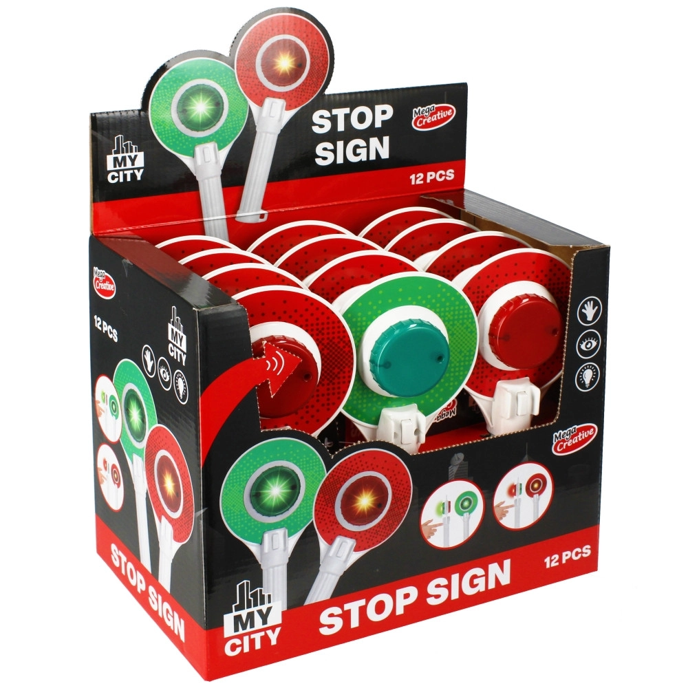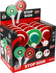 A fun accessory for little police officers: a stop sign with a light that shines green on one side and red on the other. Ideal for play and learning traffic rules, safely powered by 2× AA 1.5 V batteries (included).