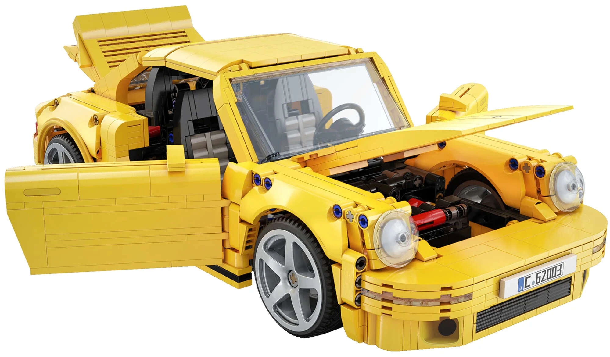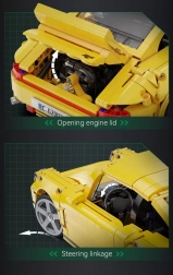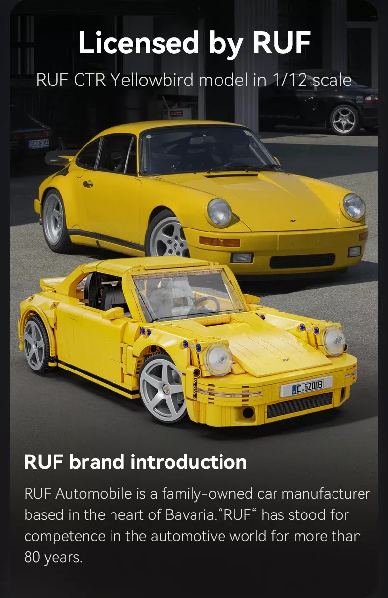 Enjoy the precise CaDA building kit that faithfully captures the legendary RUF CTR Yellowbird in bright yellow with black accents. The model stands out with realistic mechanisms, opening panels, and functional steering. Thanks to rubber tires and a richly detailed interior with authentic elements, it’s perfect for both display and play.