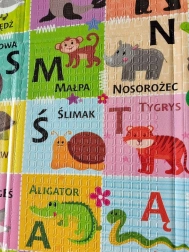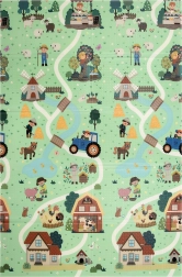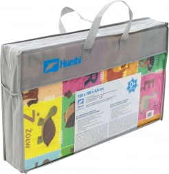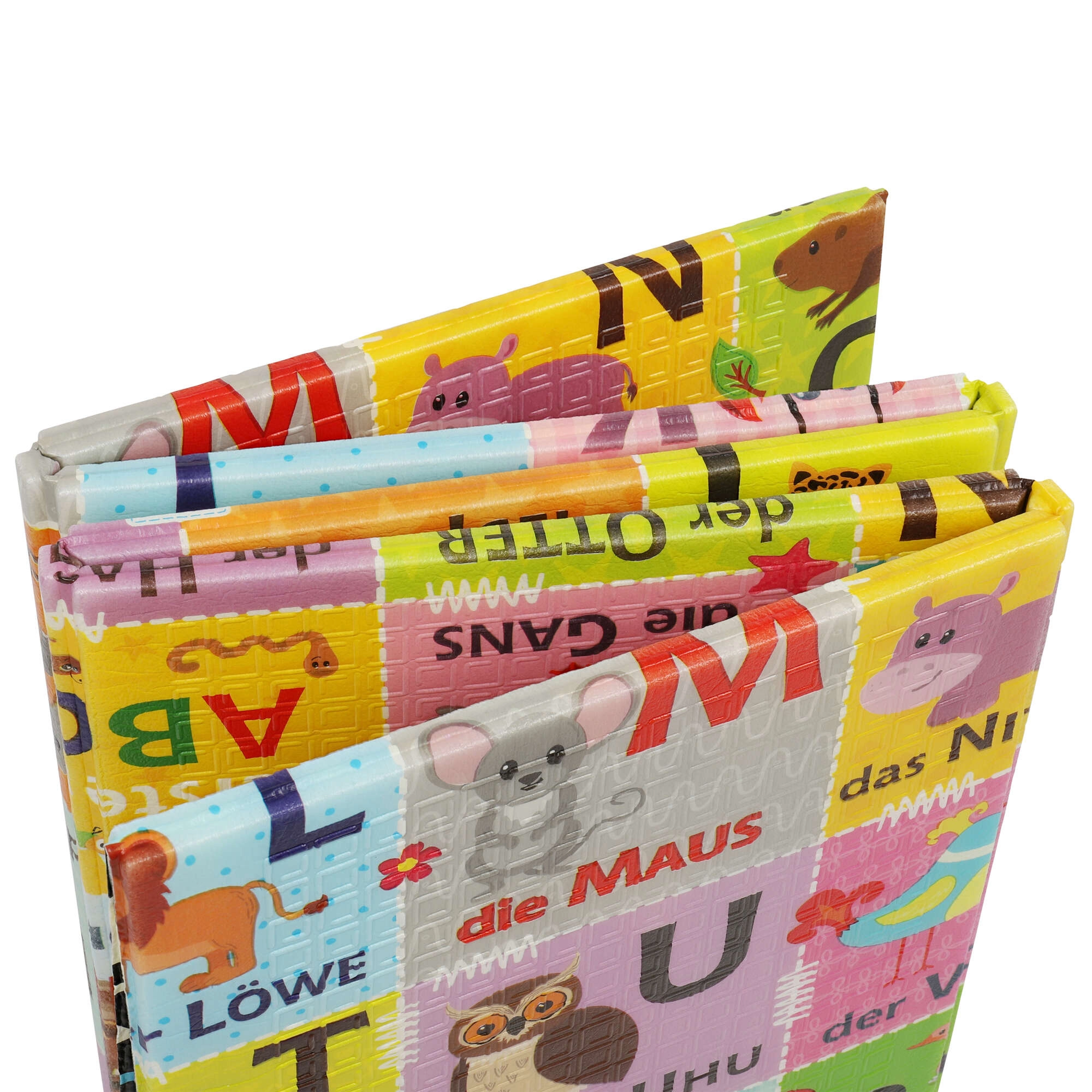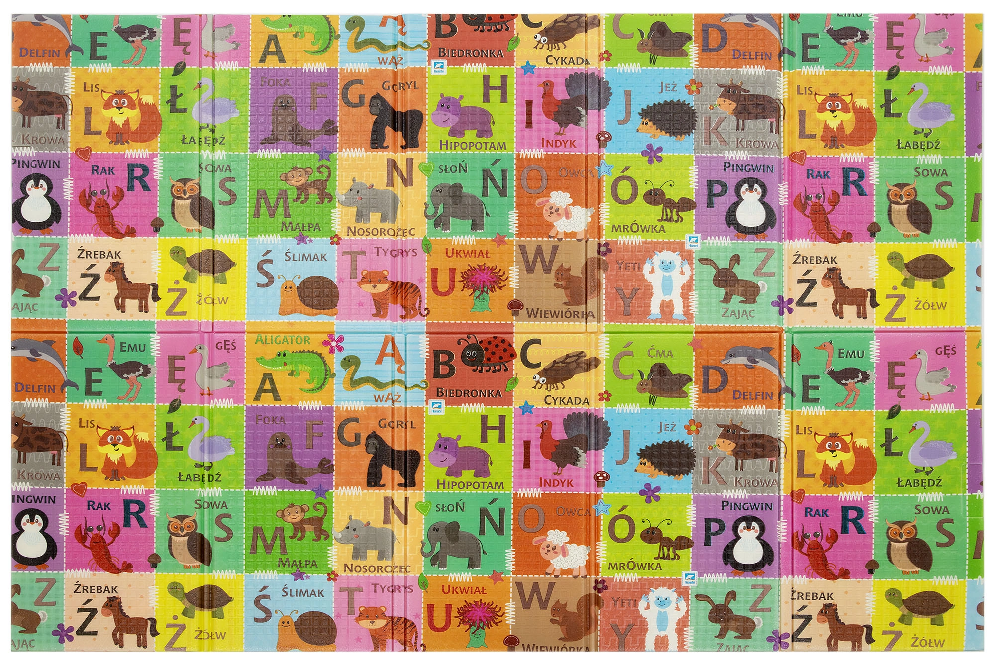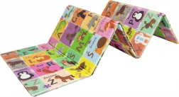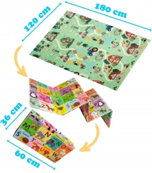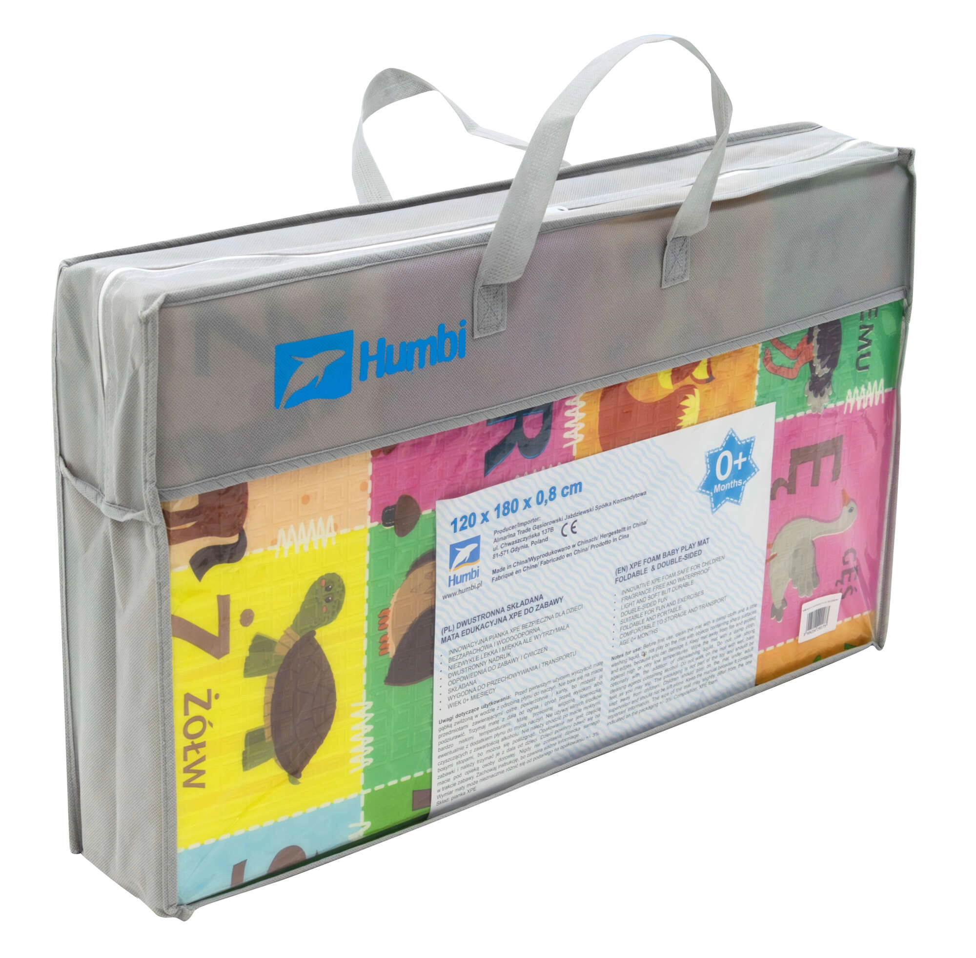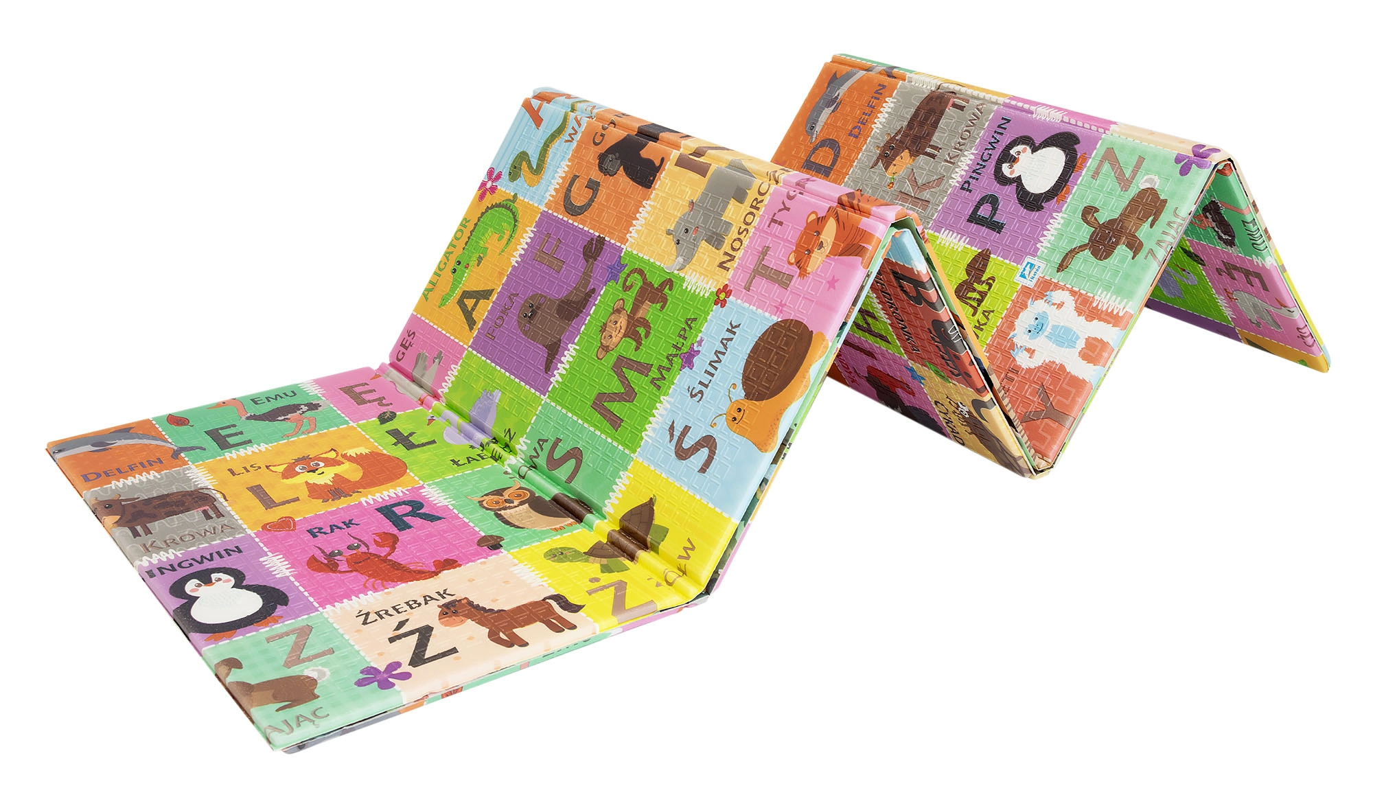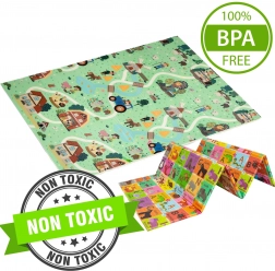 The double-sided design supports learning and creativity: one side with a colorful alphabet and animals develops letter recognition, the other side with a village, houses, and roads invites imaginative play. The mat is non-slip, waterproof, and hygienic – simply wipe with a damp cloth. Thanks to its folding construction you can fold it quickly, store it easily, and use the included bag with handle to carry it comfortably.