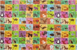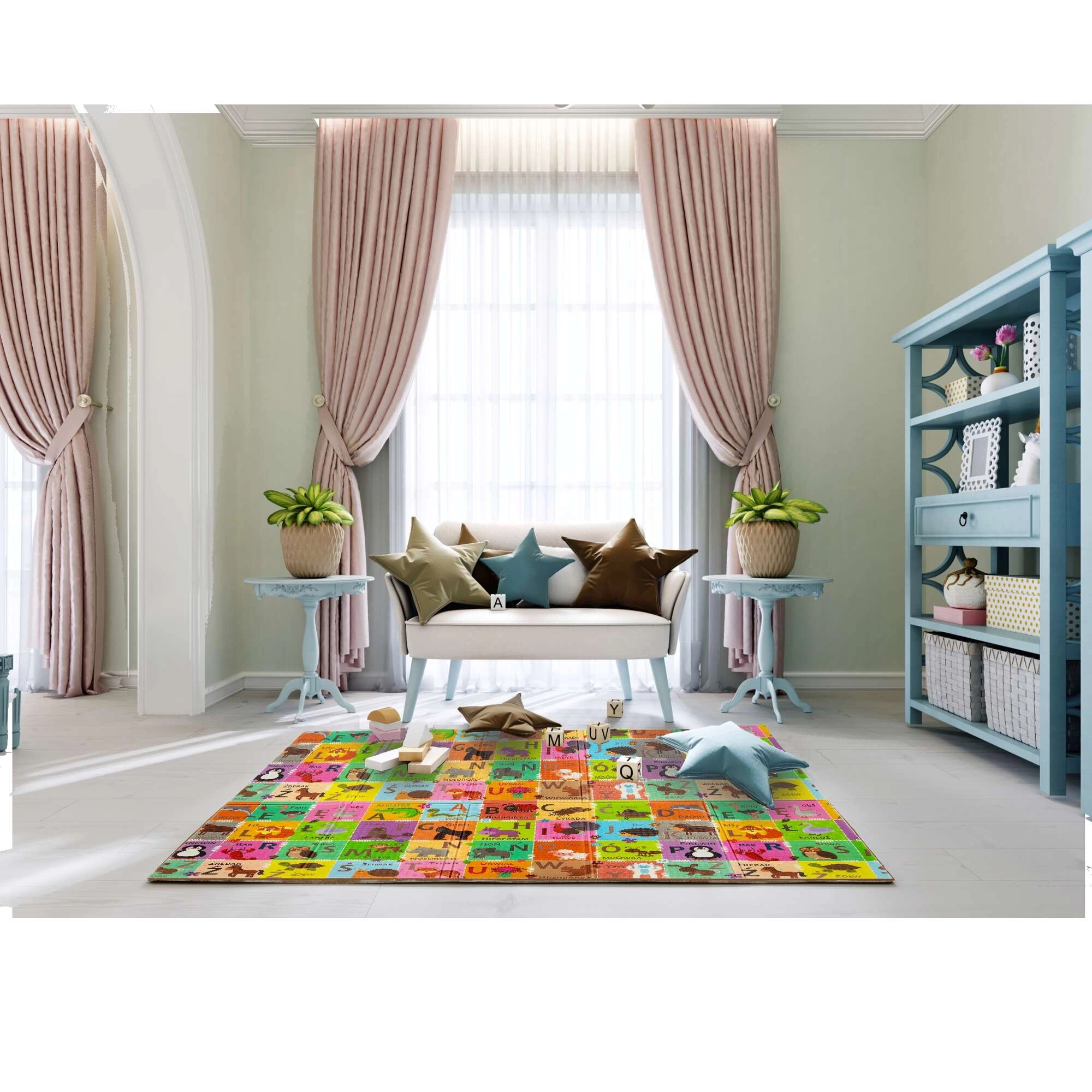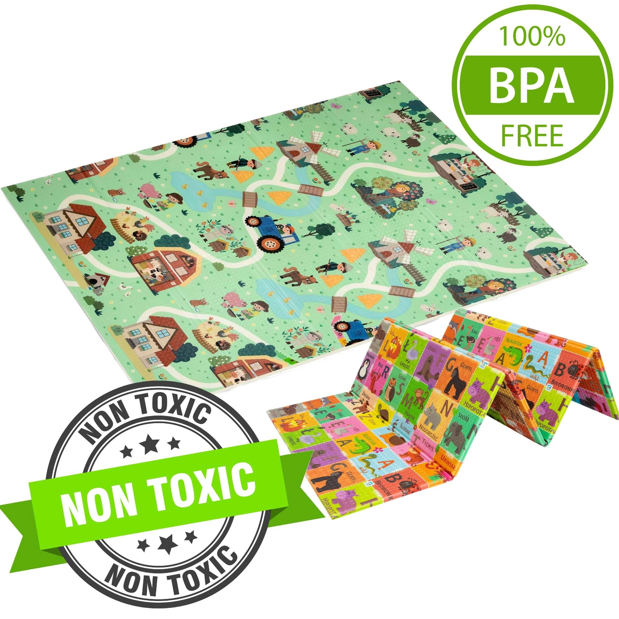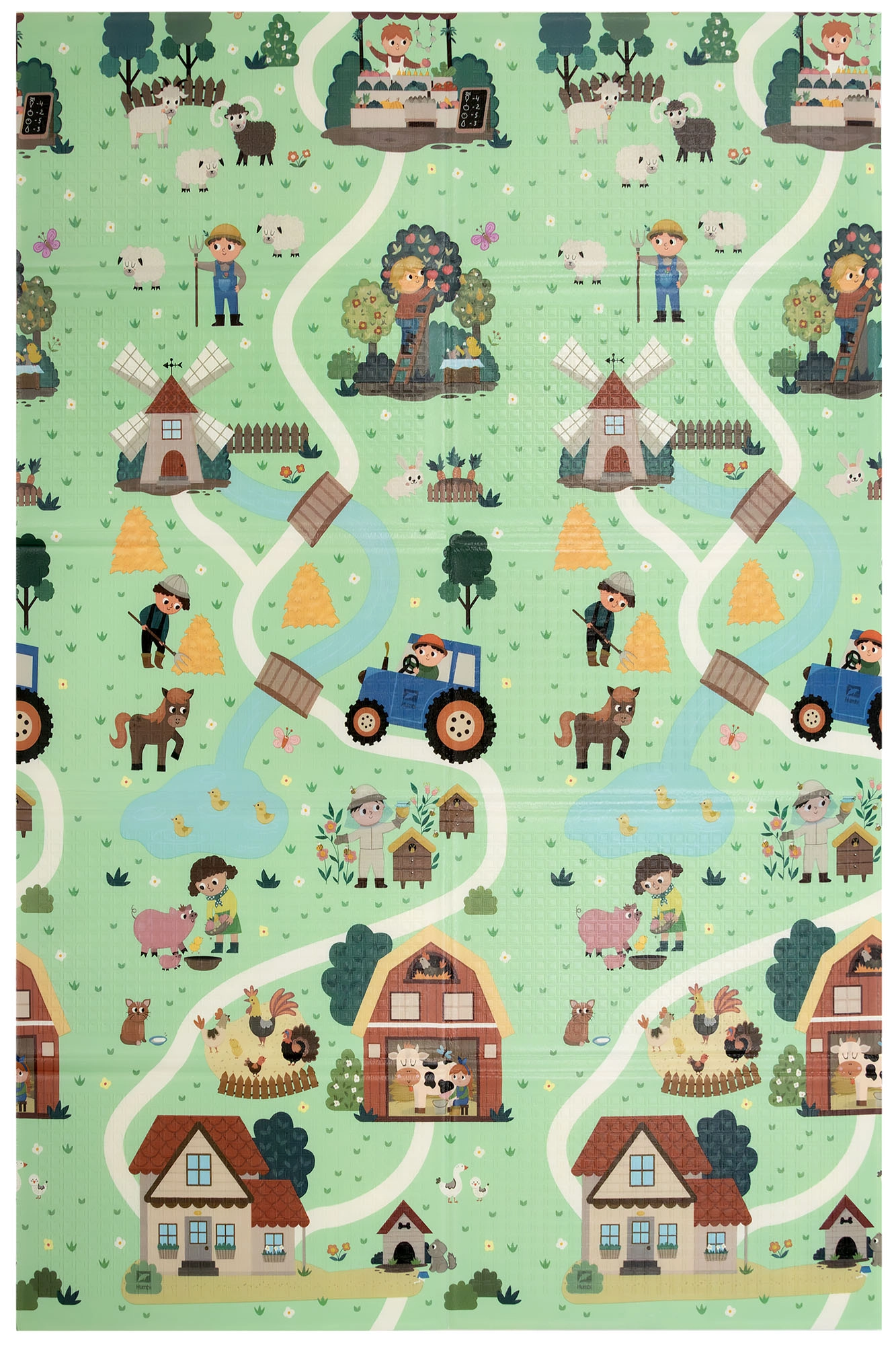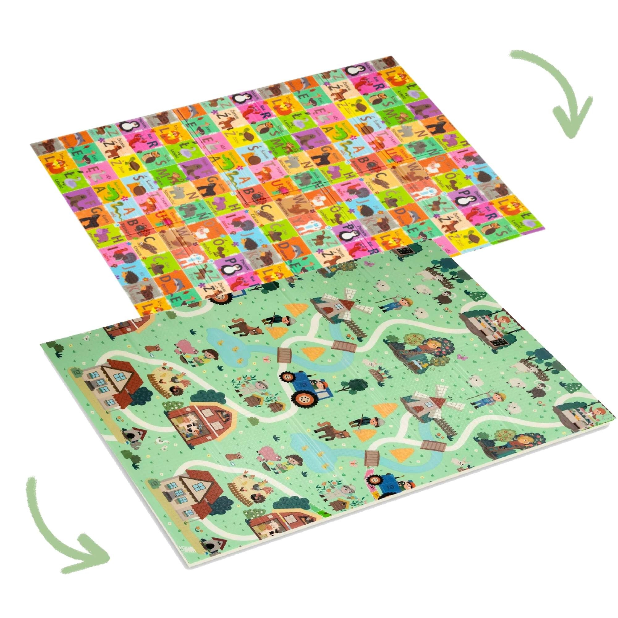One side with a cheerful alphabet and animals, the other with a painted little town and roads. Kids can practice letters and imagination while driving toy cars.