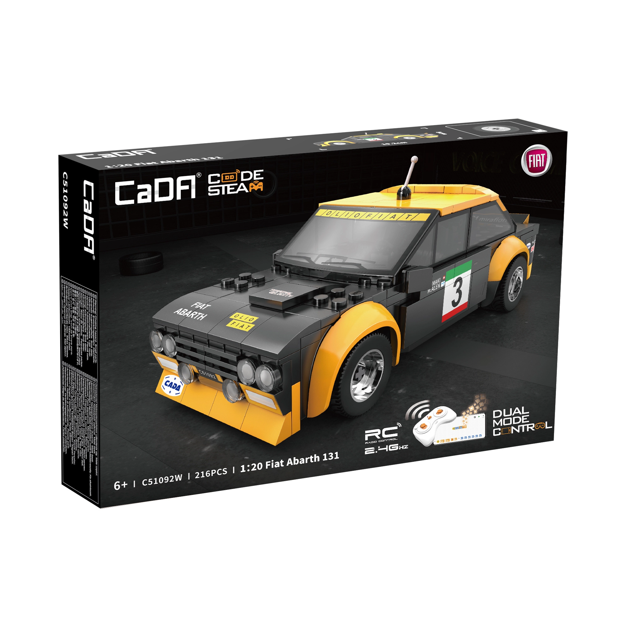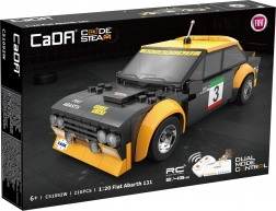 Experience dynamic driving with the detailed FIAT ABARTH 131 model at 1:20 scale. The car features black-and-yellow racing paint with decals, wide fenders, an antenna, and a realistic cockpit. Thanks to the rubber wheels, it drives smoothly on various surfaces and reaches speeds of up to 3.8 km/h.
