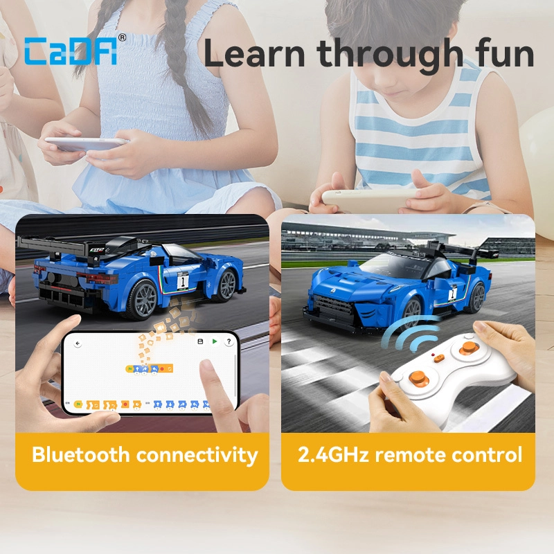 Thanks to Dual Mode, you can control the car either with the included 2.4 GHz controller or conveniently via the Bluetooth app (Android/iOS) with a range of approximately 25 meters. The model reaches a speed of up to 3.6 km/h, is compatible with other CaDA sets, and perfectly develops manual dexterity, creativity, and technical thinking.