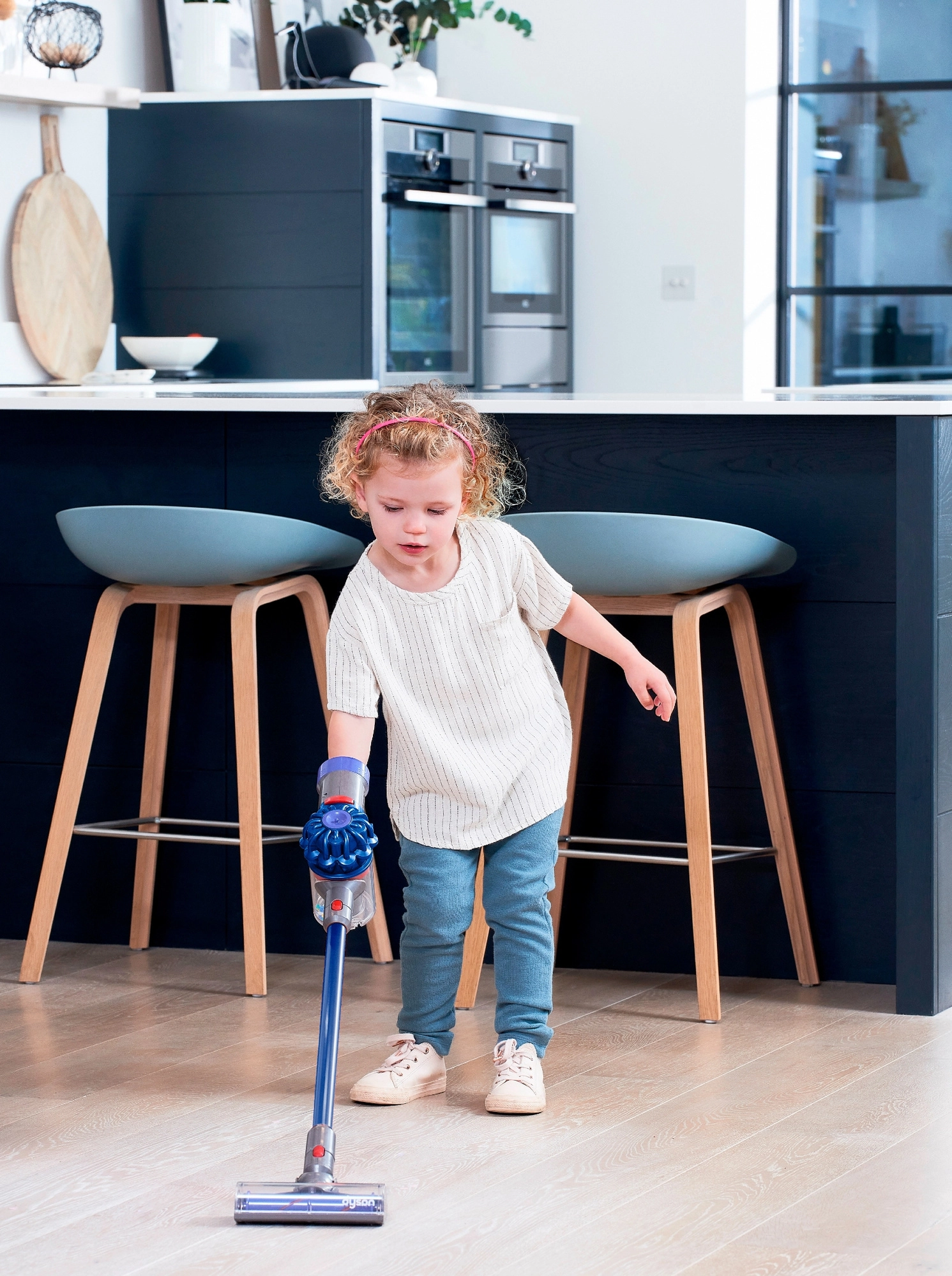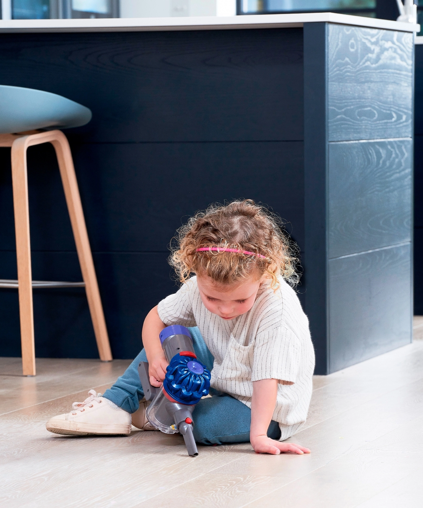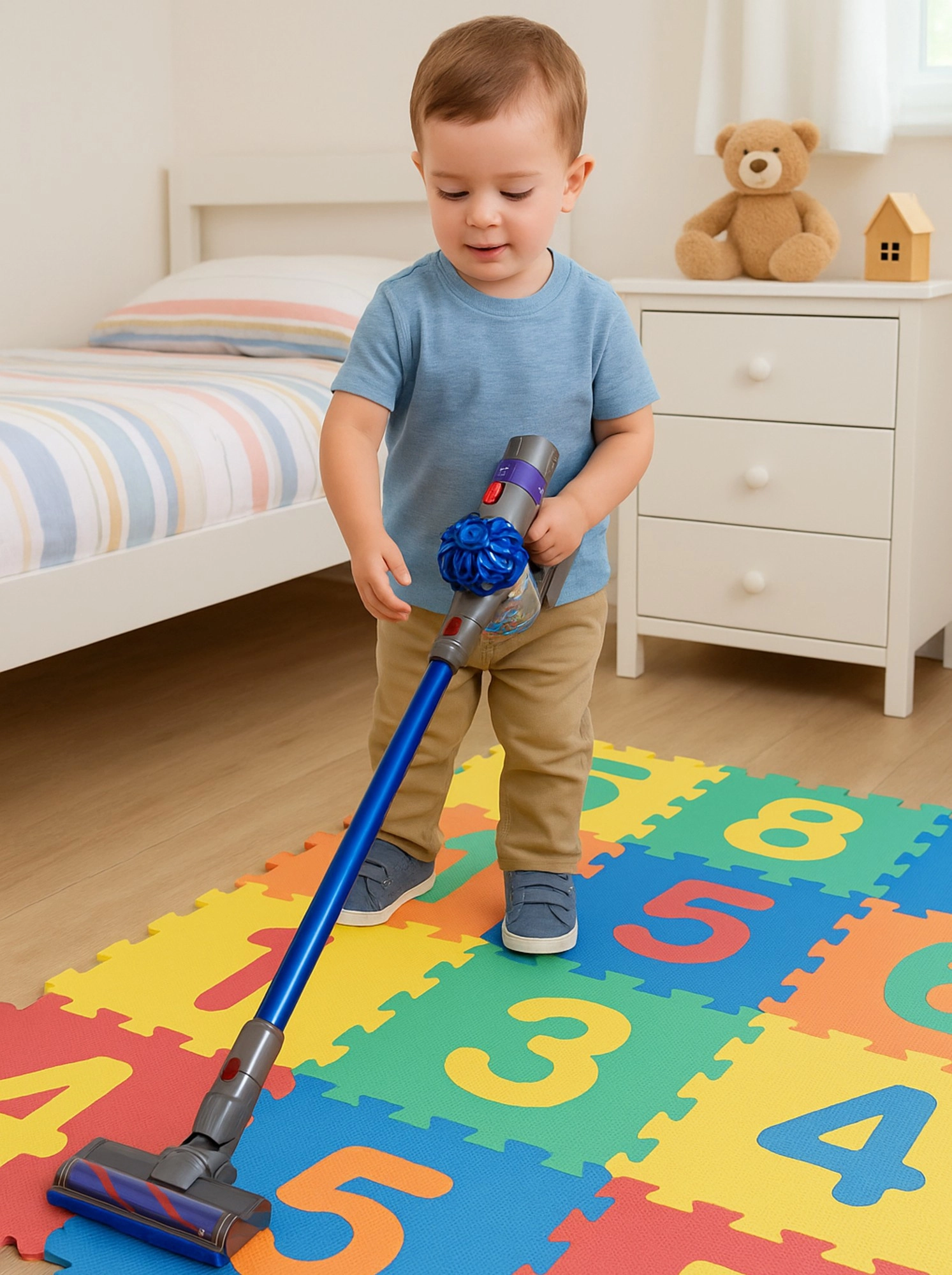 A realistic replica of a DYSON vacuum by CASDON for kids aged 3+. Light, safe, and fun – with real suction function, sound effects, and a removable dirt container. Perfect for role play and learning household chores through play.